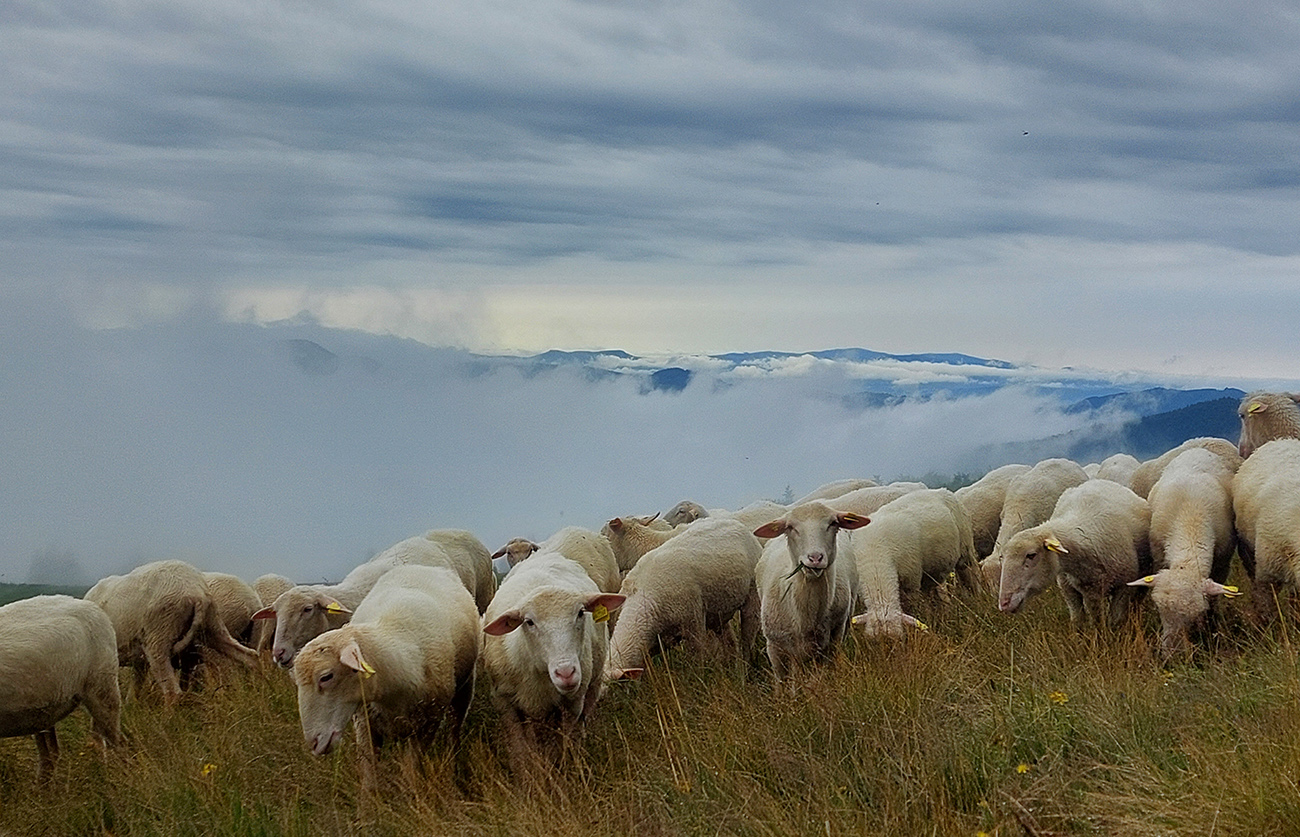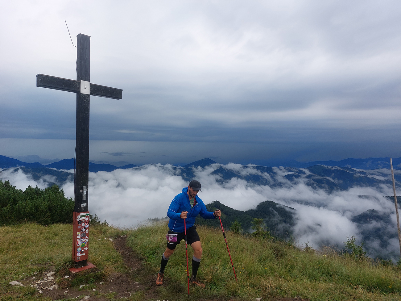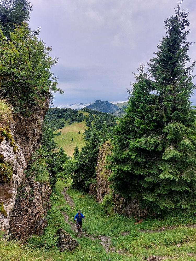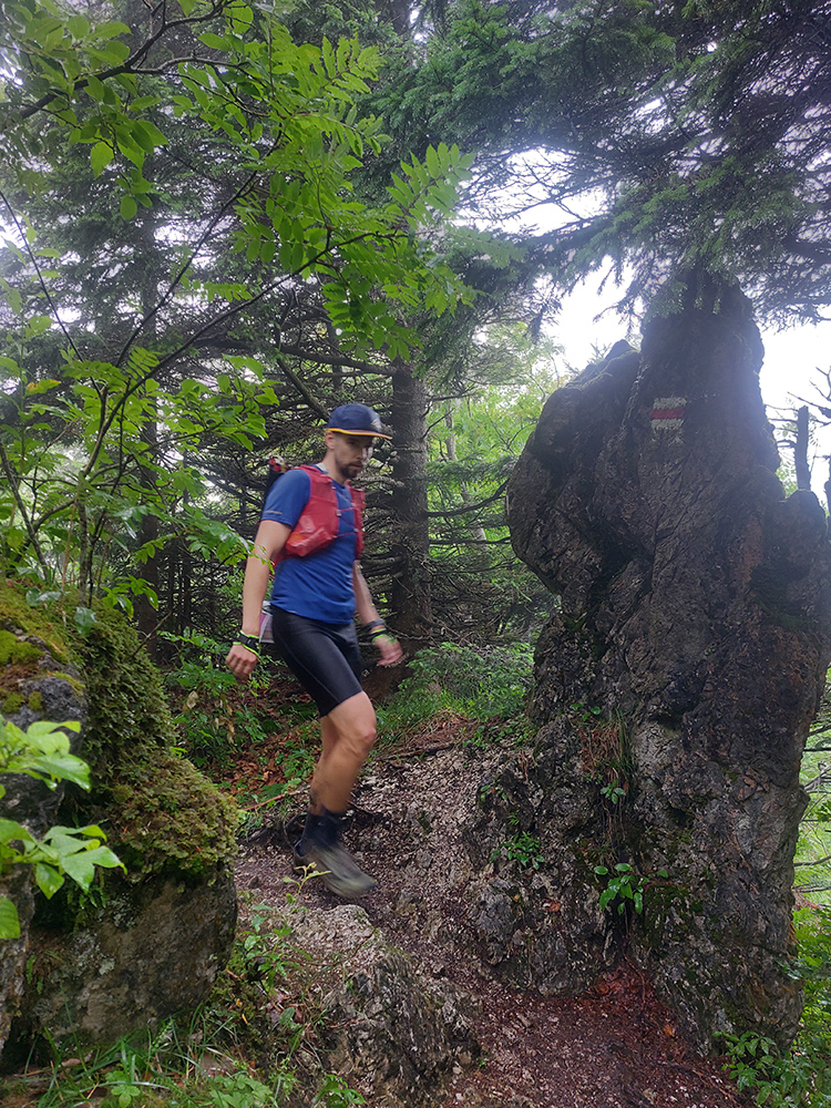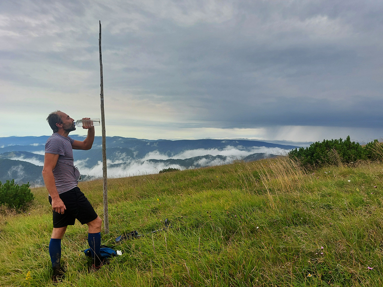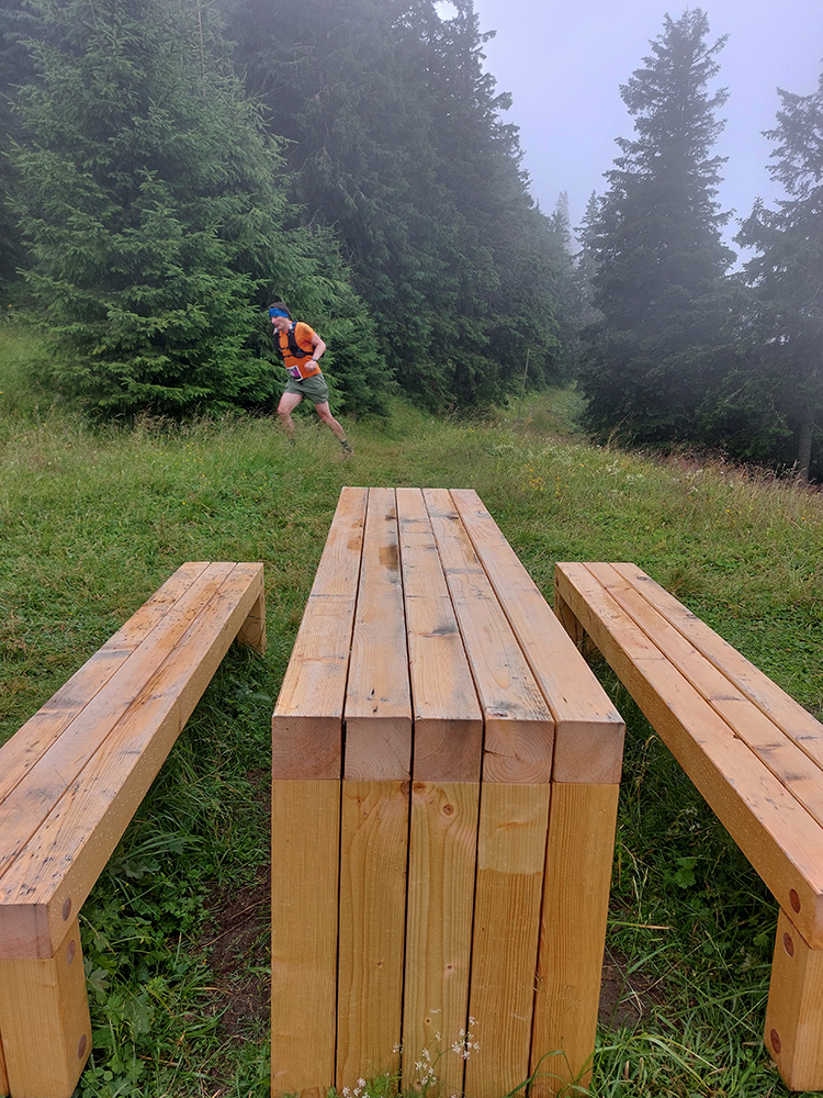 Predpeklie teda rýchlo prehrmelo a behanie až po K2 pod Borišovom (pre prvých hádam až po K3) bolo príjemné. Teda až na ten magľajz pod nohami na viacerých miestach, chcelo to zvlášť dobrý dezén. Teplota ideálna, ďaleké výhľady, biele útržky mrakov medzi kopcami a pod Ploskou stádo bečiacich kosačiek.