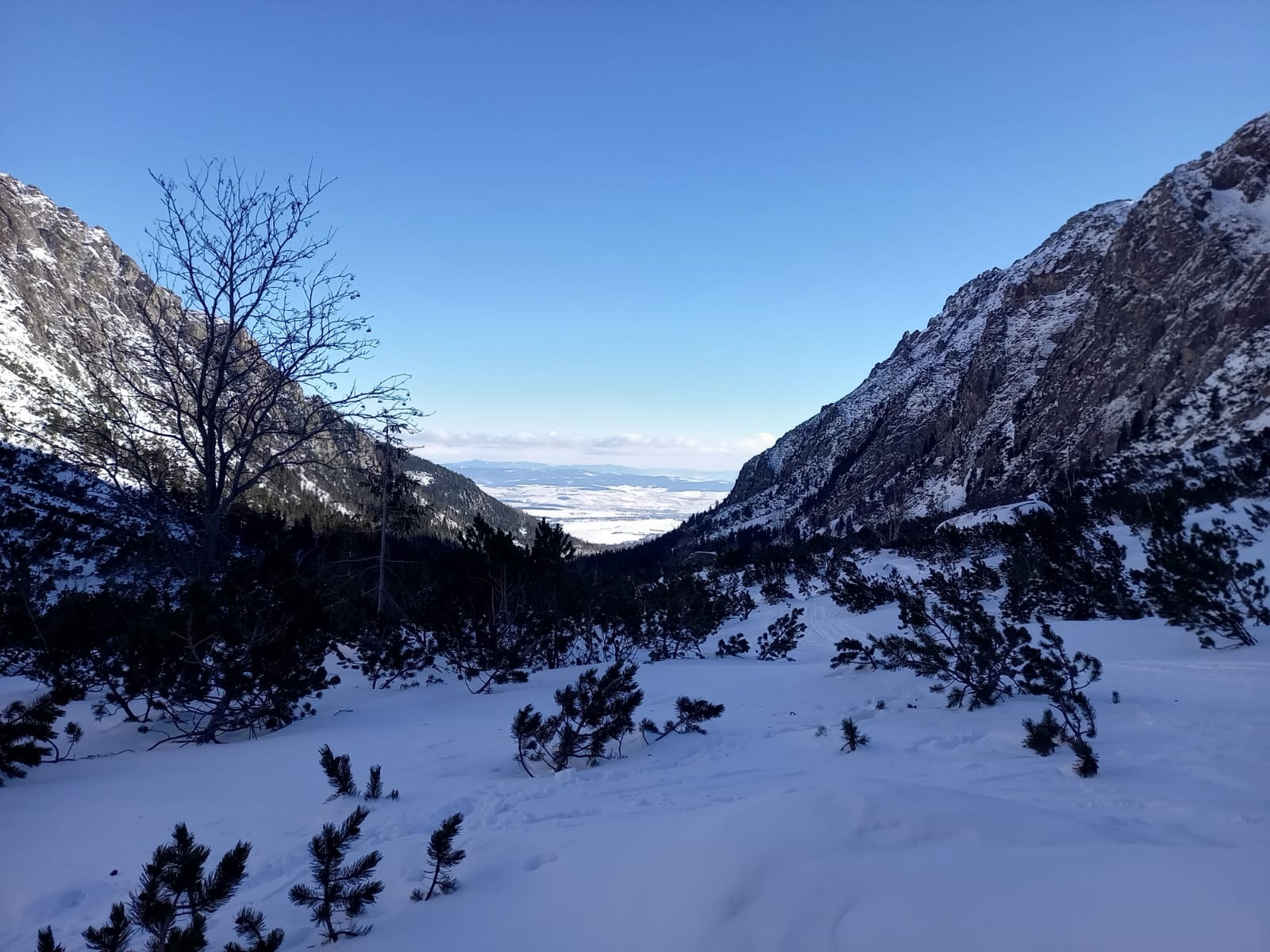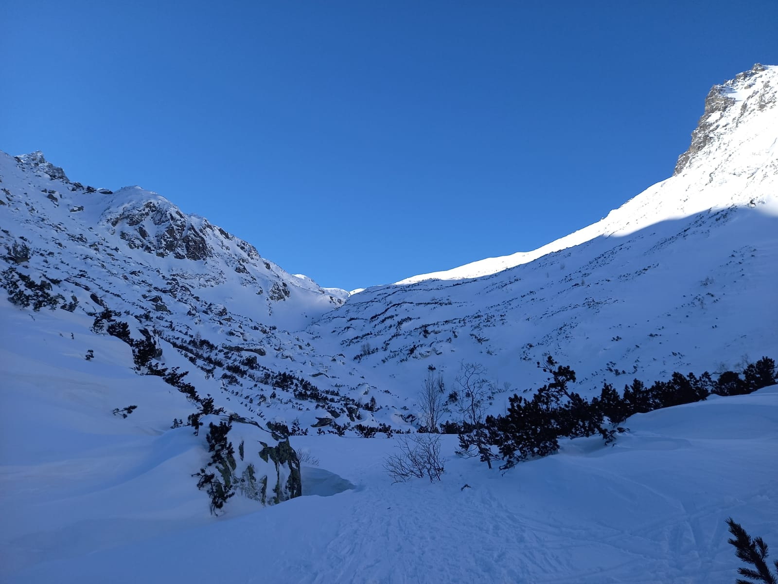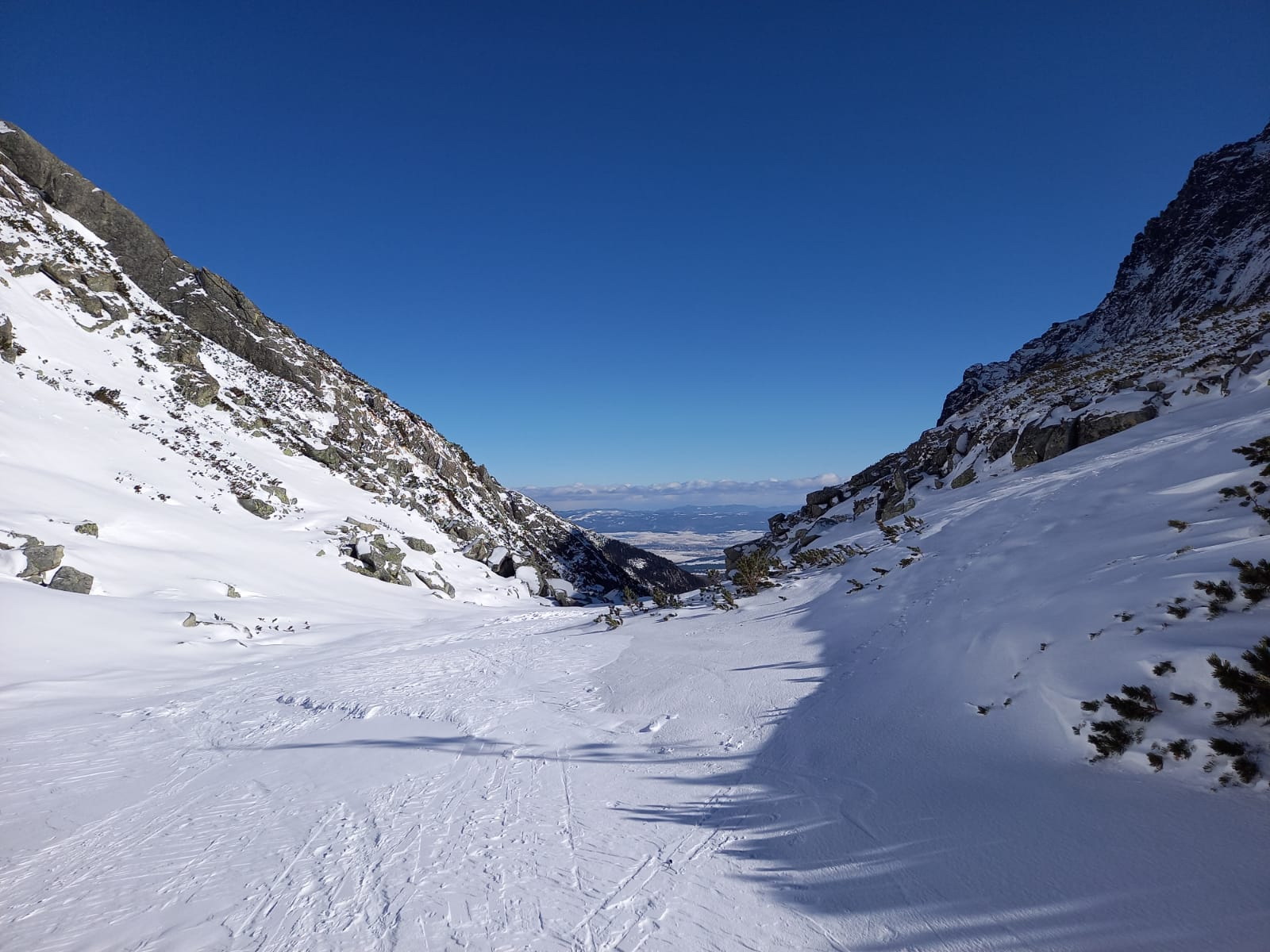 Šlapať sa dá bez problémov zo Smokovca. Dobrou variantou je stará zjazdovka po ľavej strane pozemnej lanovky. Z Hrebienka magistrála tiež vysnežená. Húpačky a chodník v doline silne vyfúkané a miestami ľadové. V doline ešte chýba sneh ale s trochou opatrnosti sa dá bez škrabancov. Nad Bránou už snehu pribúda a v Generáli a v Závrati podmienky celkom dobré. V ľavej strane Závraťu stopy po vypadnutej lavíne (asi včera). Stopa prešlapaná až hore ale dnes tu lyžovalo iba pár ľudí.