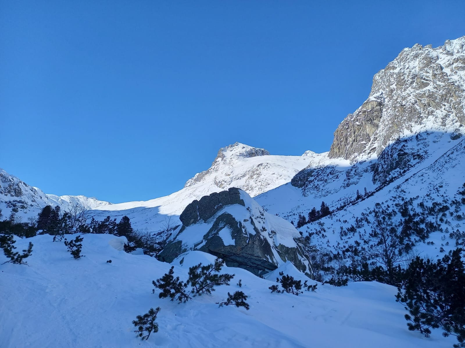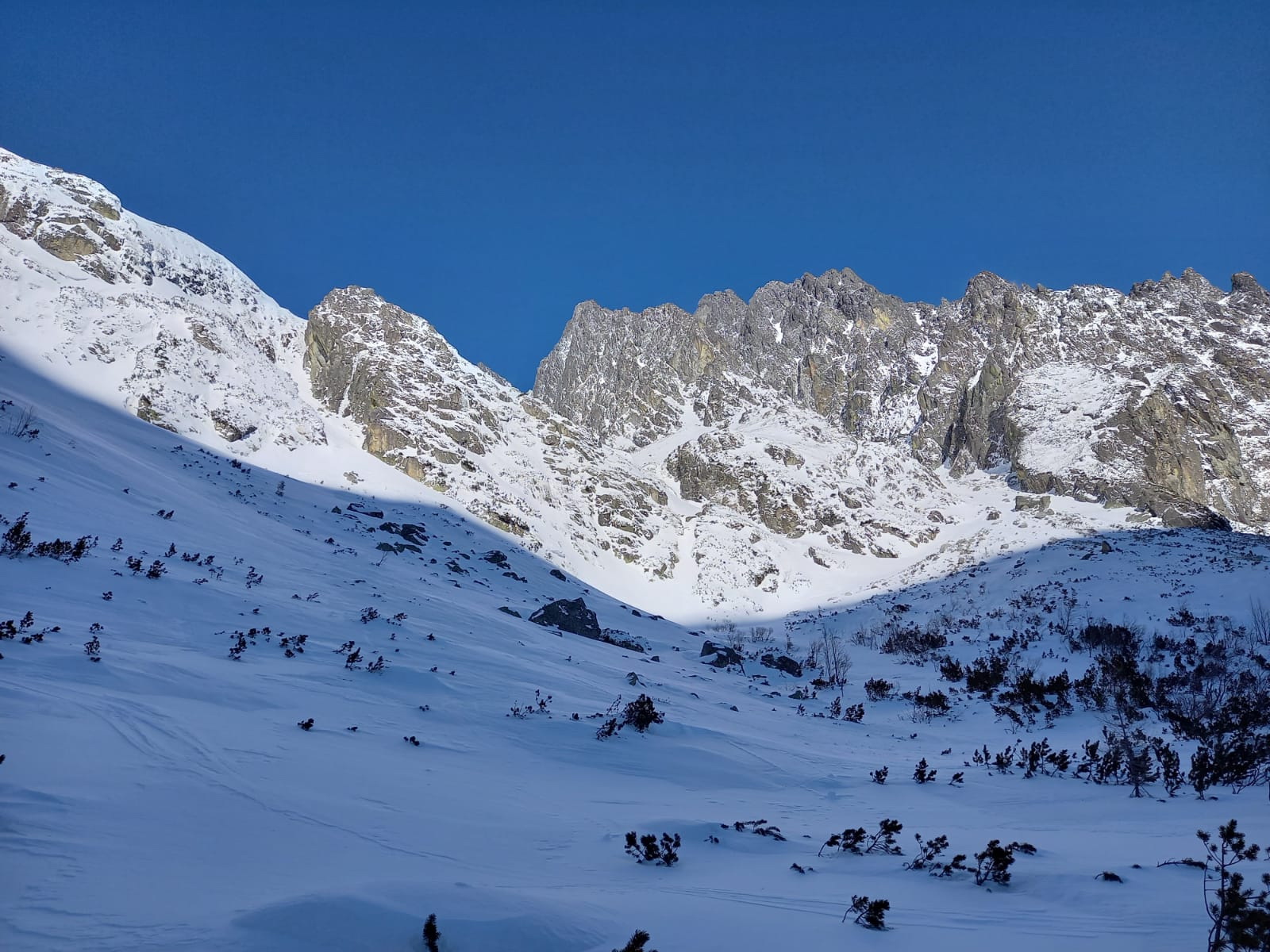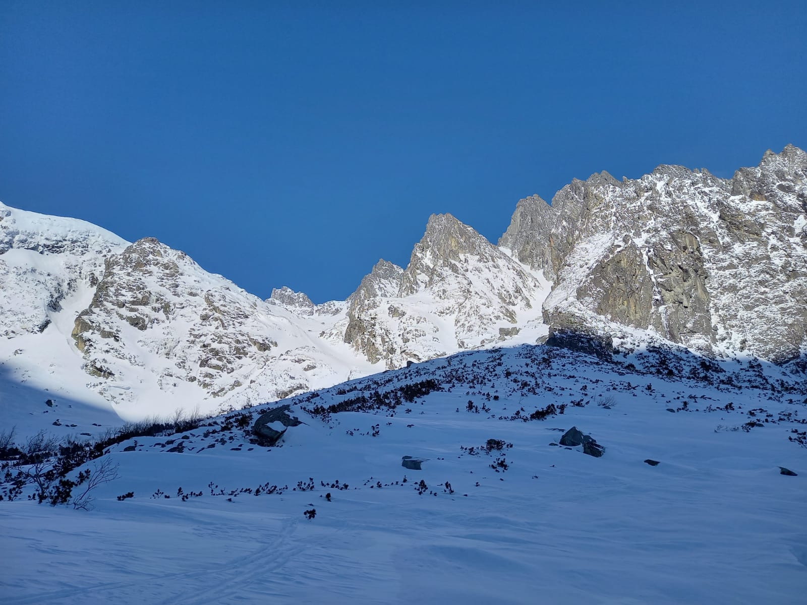 Šlapať sa dá bez problémov zo Smokovca. Dobrou variantou je stará zjazdovka po ľavej strane pozemnej lanovky. Z Hrebienka magistrála tiež vysnežená. Húpačky a chodník v doline silne vyfúkané a miestami ľadové. V doline ešte chýba sneh ale s trochou opatrnosti sa dá bez škrabancov. Nad Bránou už snehu pribúda a v Generáli a v Závrati podmienky celkom dobré. V ľavej strane Závraťu stopy po vypadnutej lavíne (asi včera). Stopa prešlapaná až hore ale dnes tu lyžovalo iba pár ľudí.
