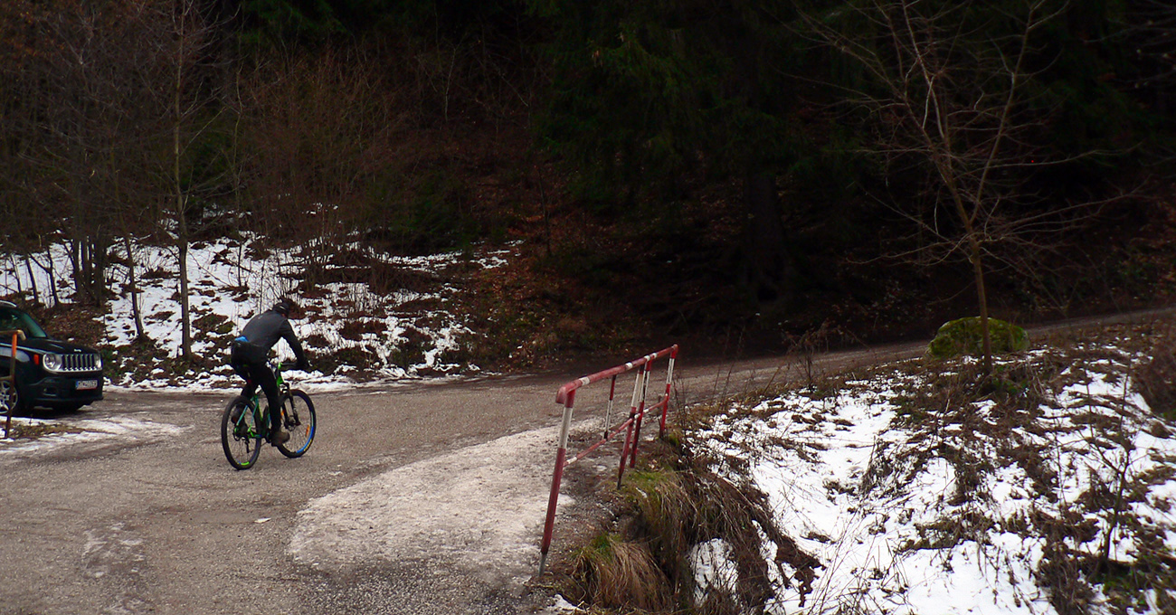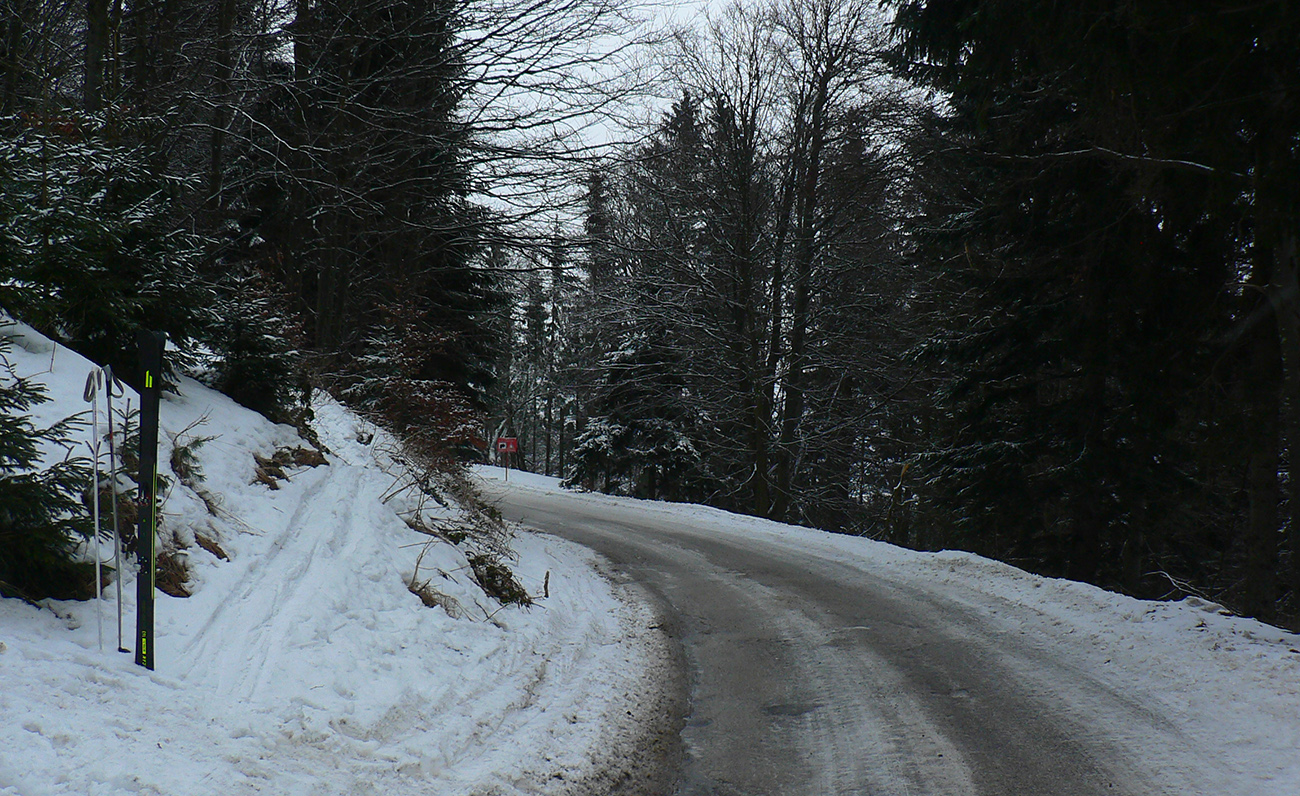 V nedeľu ráno dole ešte pršalo, do večera to začalo mrznúť a v pondelok ráno na mostíku na začiatku serpentín také hrboľato-klzké predjarie. Až nad delom ( okolo 900 m) dáke súvislé snehoľady pod nohami škrípali a do lyží som naskočil až na asfaltke – cez Kalužnú už to ide v pohode. Na zmrznutom dáky cenťák prášku, aspoň aby to nehrkotalo.