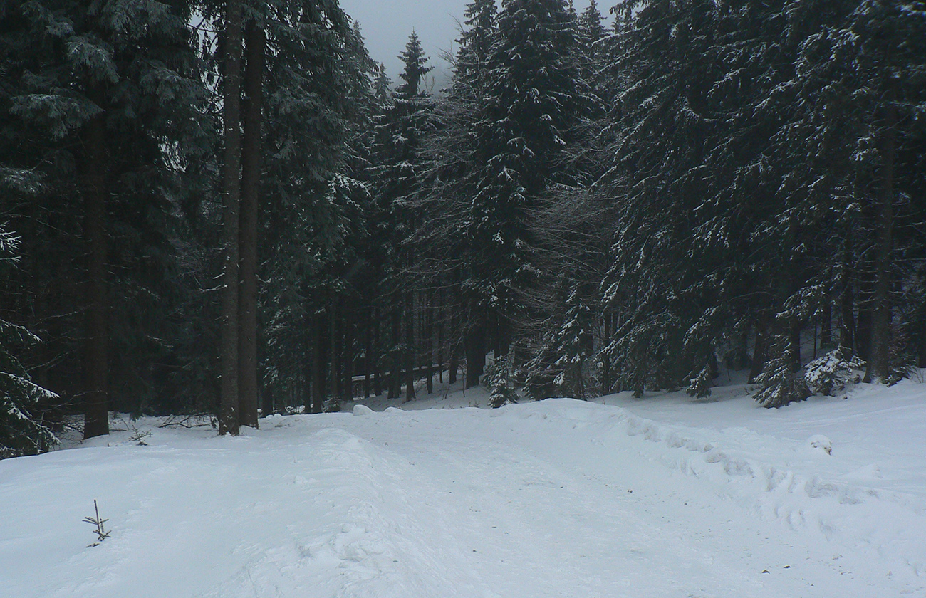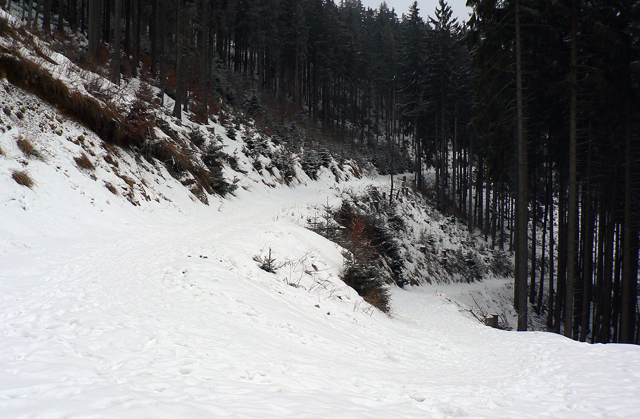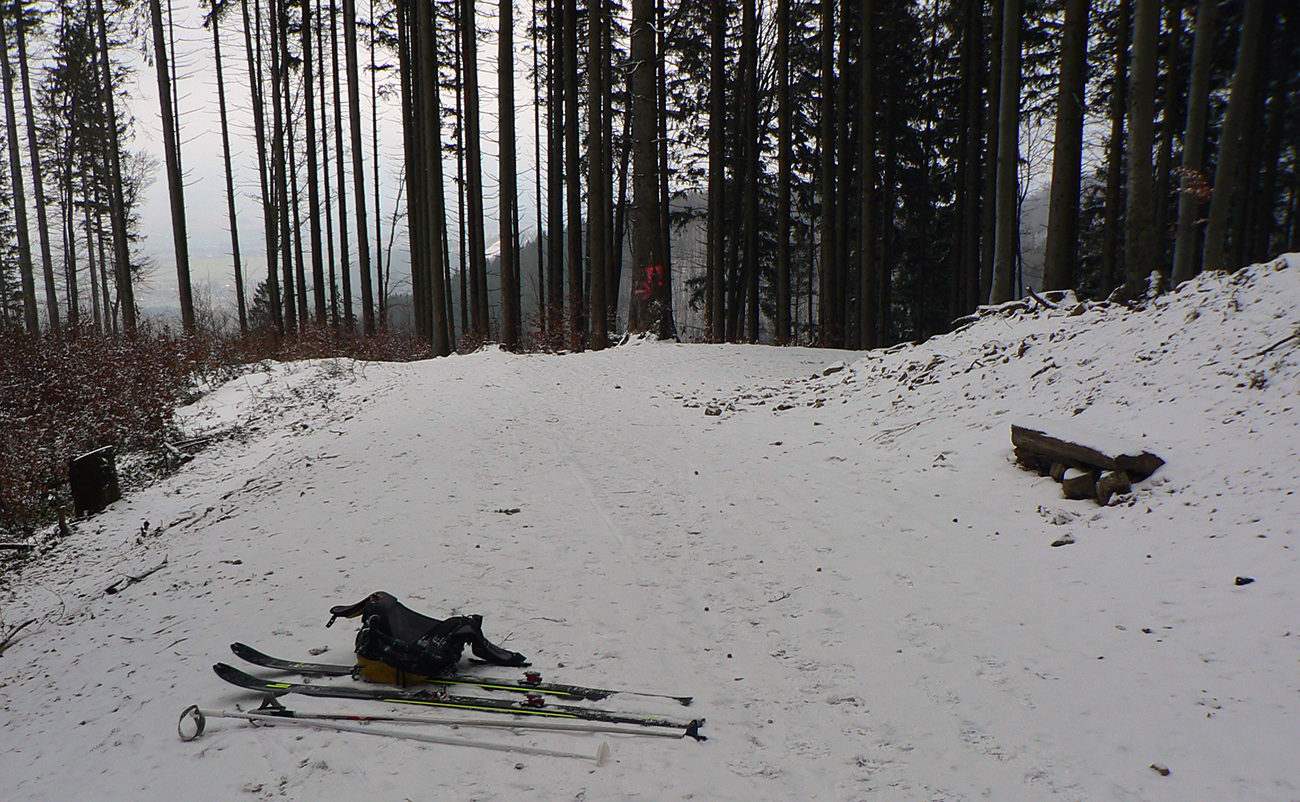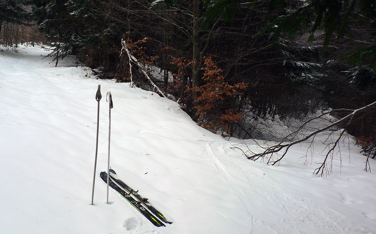 Ako začína strmší zostup do Turatínskeho sedla, doľava odbočuje relatívne nové rúbanisko. Sklon akurátny, neodolal som... V hornej časti paráda, na drsnom ľade tak akurát páperia na oporu v oblúkoch. Dolná polovica, to už bol husto postavený slalom, ale dalo sa. Potom ešte pár oblúčikov po zvážnici a ďalšia pohodlná zvážnica do kopca do Turatínskeho sedla. Zo sedla vedie chodník na Ostrô hore hustým lesom, tak pod lyžami škripot špinavého ľadu, potom už po vlastných stopách až na Hornú lúku takmer potichu.