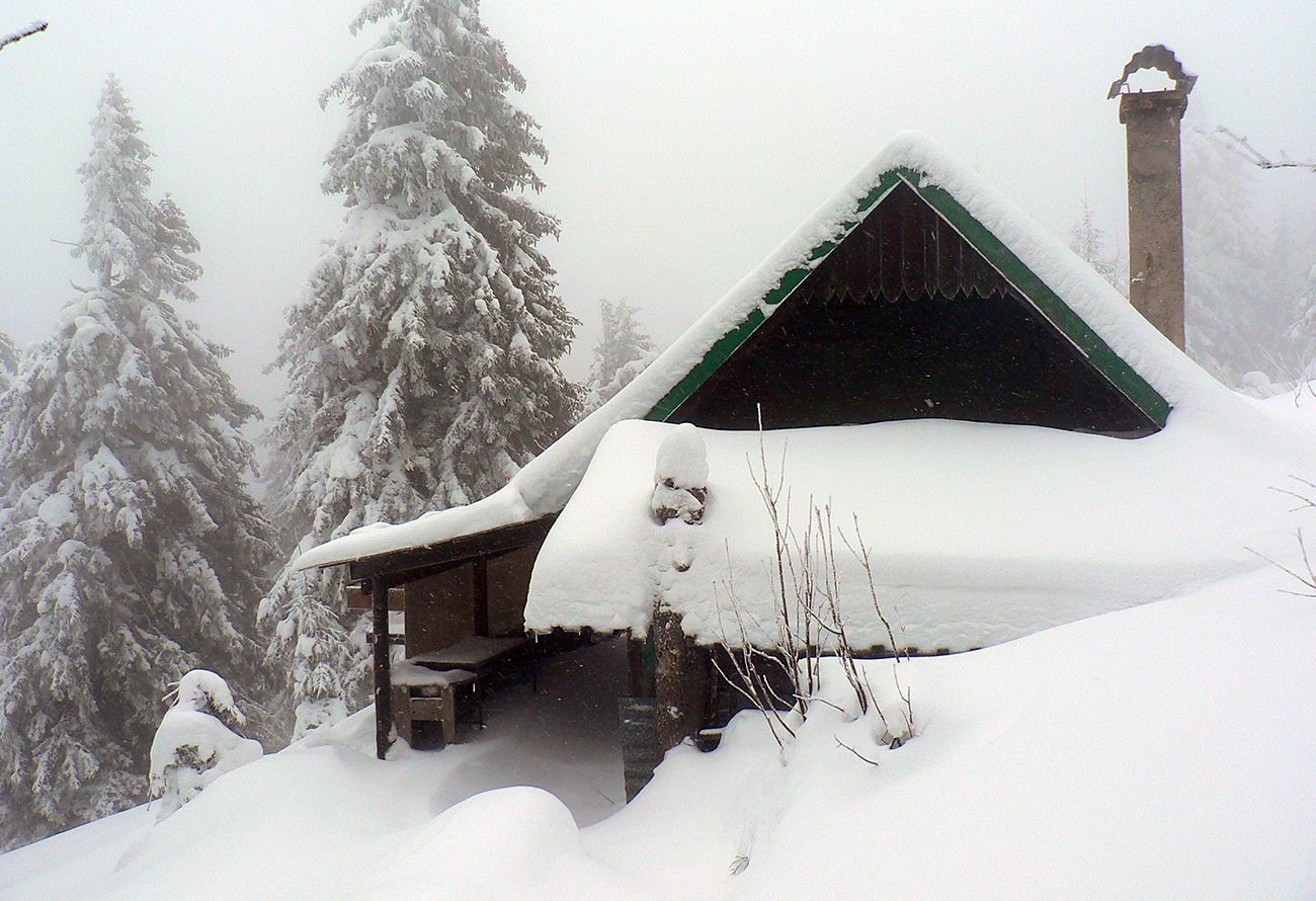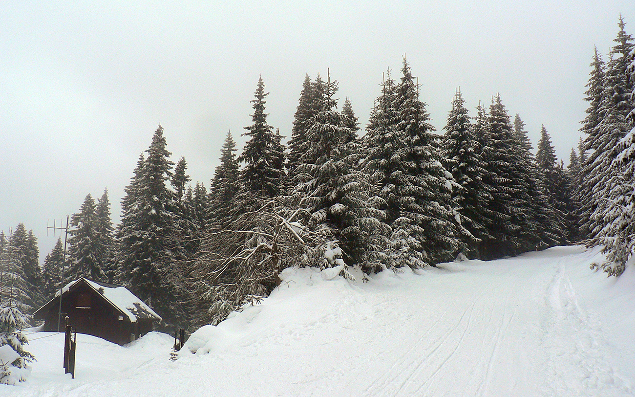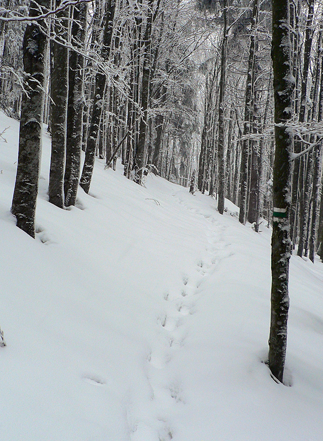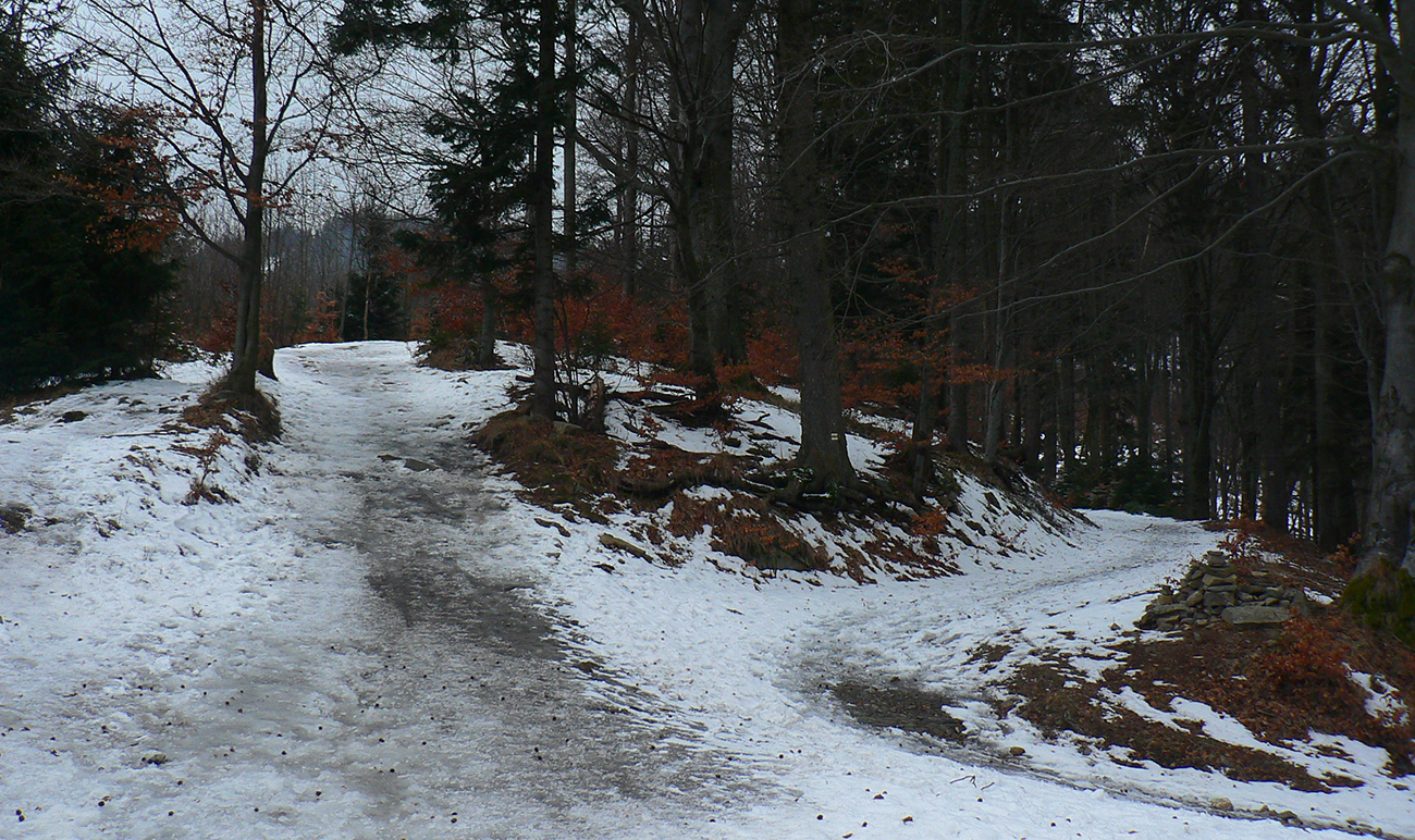 Ako začína strmší zostup do Turatínskeho sedla, doľava odbočuje relatívne nové rúbanisko. Sklon akurátny, neodolal som... V hornej časti paráda, na drsnom ľade tak akurát páperia na oporu v oblúkoch. Dolná polovica, to už bol husto postavený slalom, ale dalo sa. Potom ešte pár oblúčikov po zvážnici a ďalšia pohodlná zvážnica do kopca do Turatínskeho sedla. Zo sedla vedie chodník na Ostrô hore hustým lesom, tak pod lyžami škripot špinavého ľadu, potom už po vlastných stopách až na Hornú lúku takmer potichu.