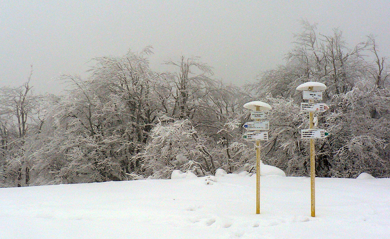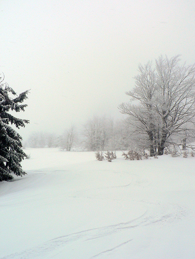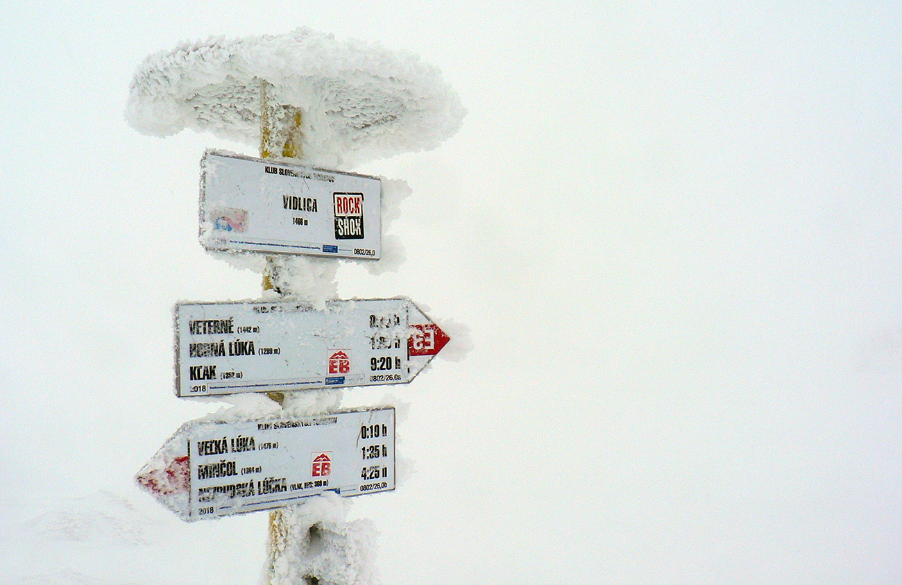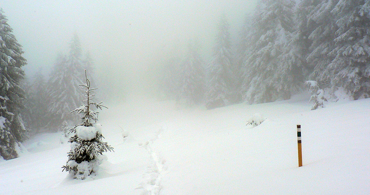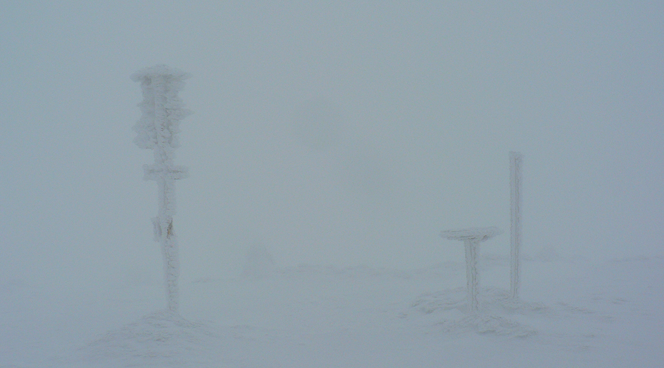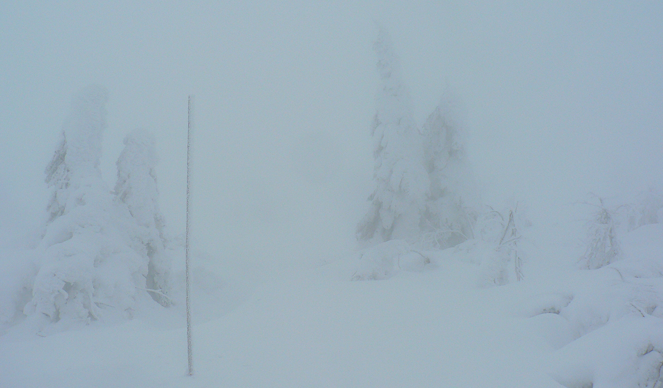 Zo zjazdoviek som potom po ratračke odbočil smerom na Veľkú lúku a hneď nad lesom nastala klasická miestna neviditeľnosť. A tak až pod Veterné, aj s podporným fukerom zo severozápadu. Za Vidlicou celkom navigačná výzva, ledva od tyče k tyči bolo vidno a pod nohy už vôbec nič. Len podľa zvuku striedanie ľadových rašplí a nových snehových jazykov. V kosovke za vysielačom miestami ešte vlnobitie, ale už je to tam celkom pekne zaviate, skoro do roviny.