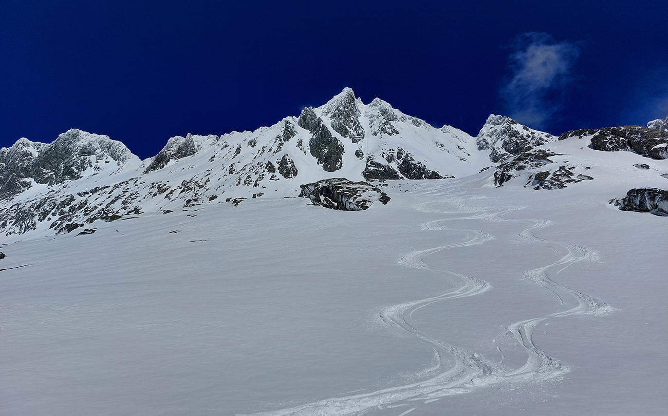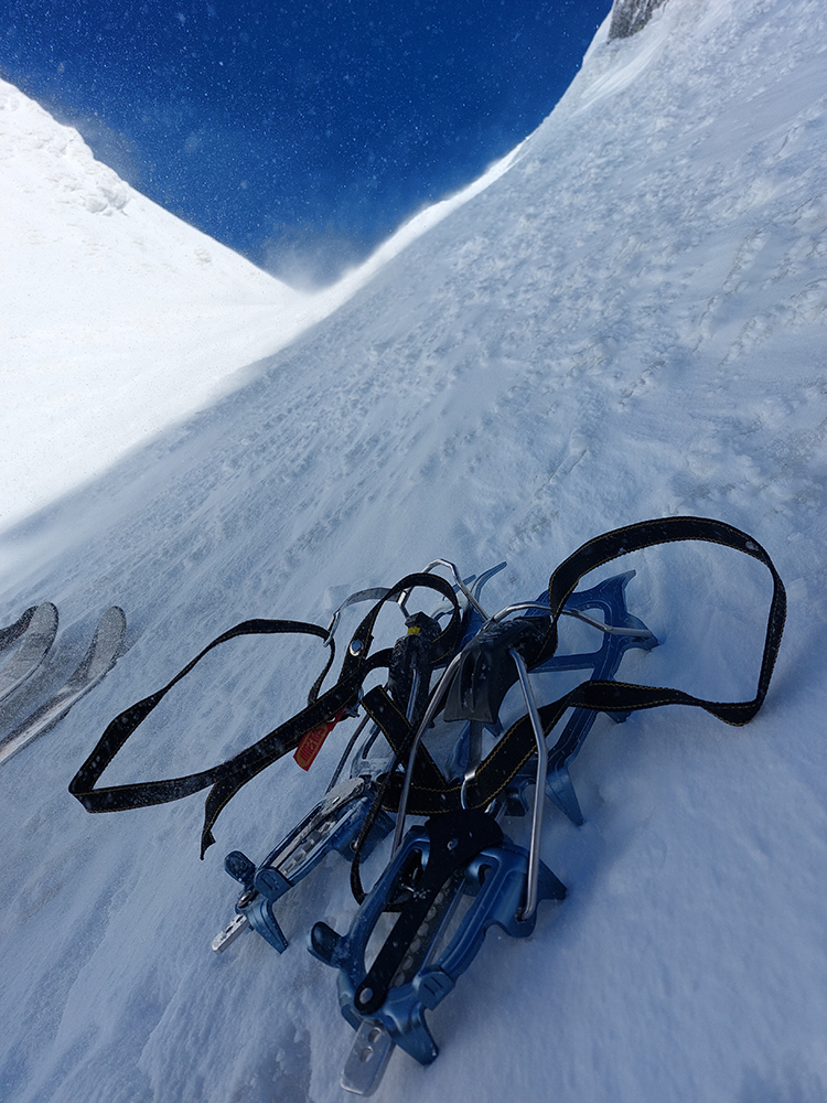 Strmý južný traverz ponad Ľadové pleso, to bol taký hic, že fuj. A suchý sneh hneď sa zmenil na lepidlo. Lenže nezlepené s podkladom. Depo na križovatke výstupov do Východnej Železnej a Zlomiskovej štrbiny: mačky jednoznačne! Tam dole nového snehu aj do 20 cm, hore ale bolo vidno ľad.