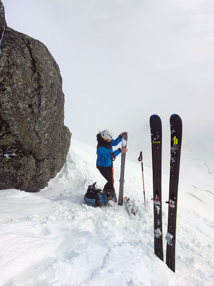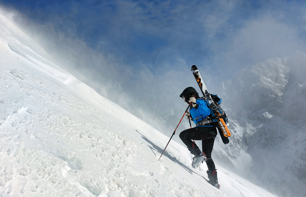 Aj tak bolo: schodíky sme síce už mali, ale hore boli víchrom zaviate, ani mačky sa do toho ľadu miestami moc nechceli zasekávať. Posledné metre pekne po špičkách. Hore prevej, za ním neviditeľno, ako tam nárazy uragánu vírili sneh. V ich prestávkach sa zdola škeril čerstvo načechraný a poriadne veľký vankúš – no neodvážil by som sa tam nalyžovať.