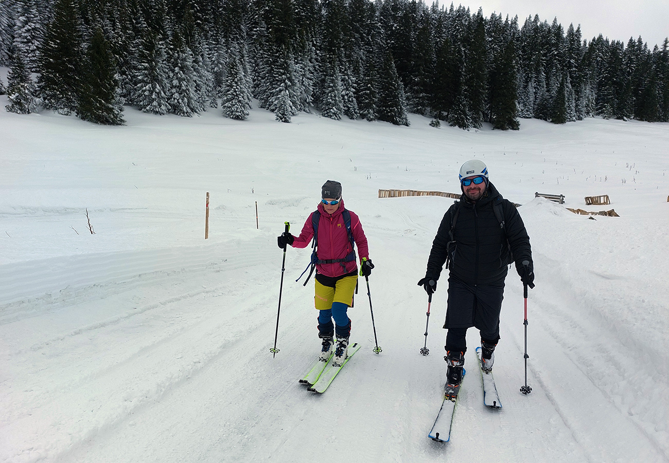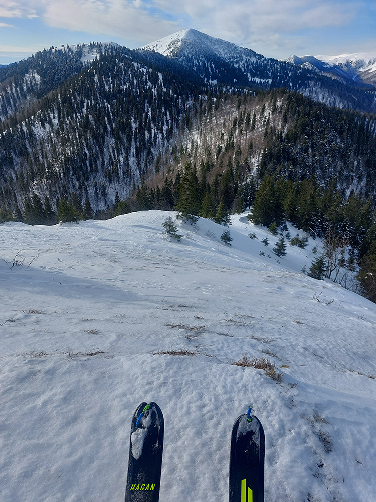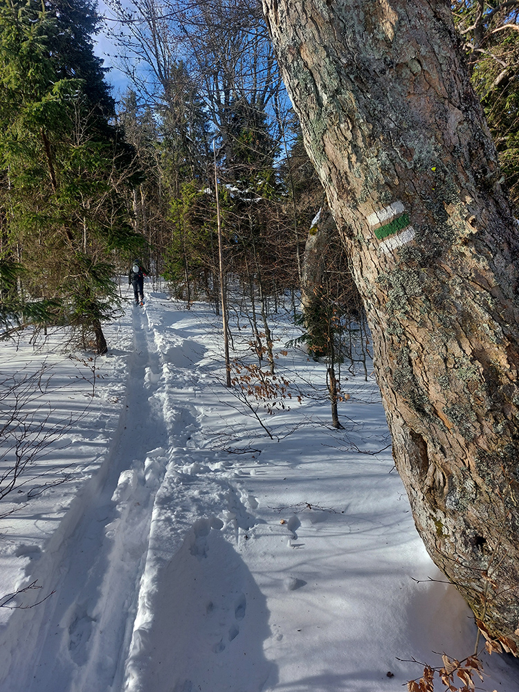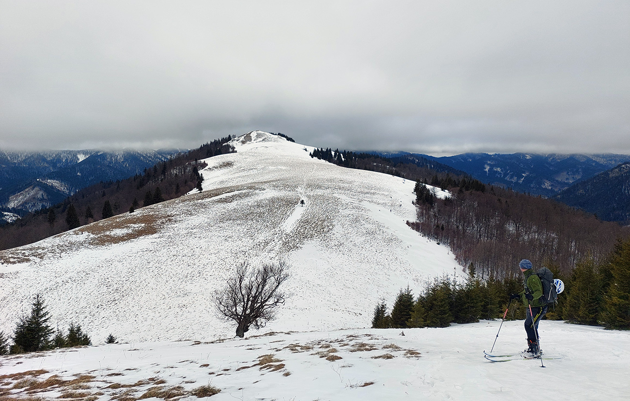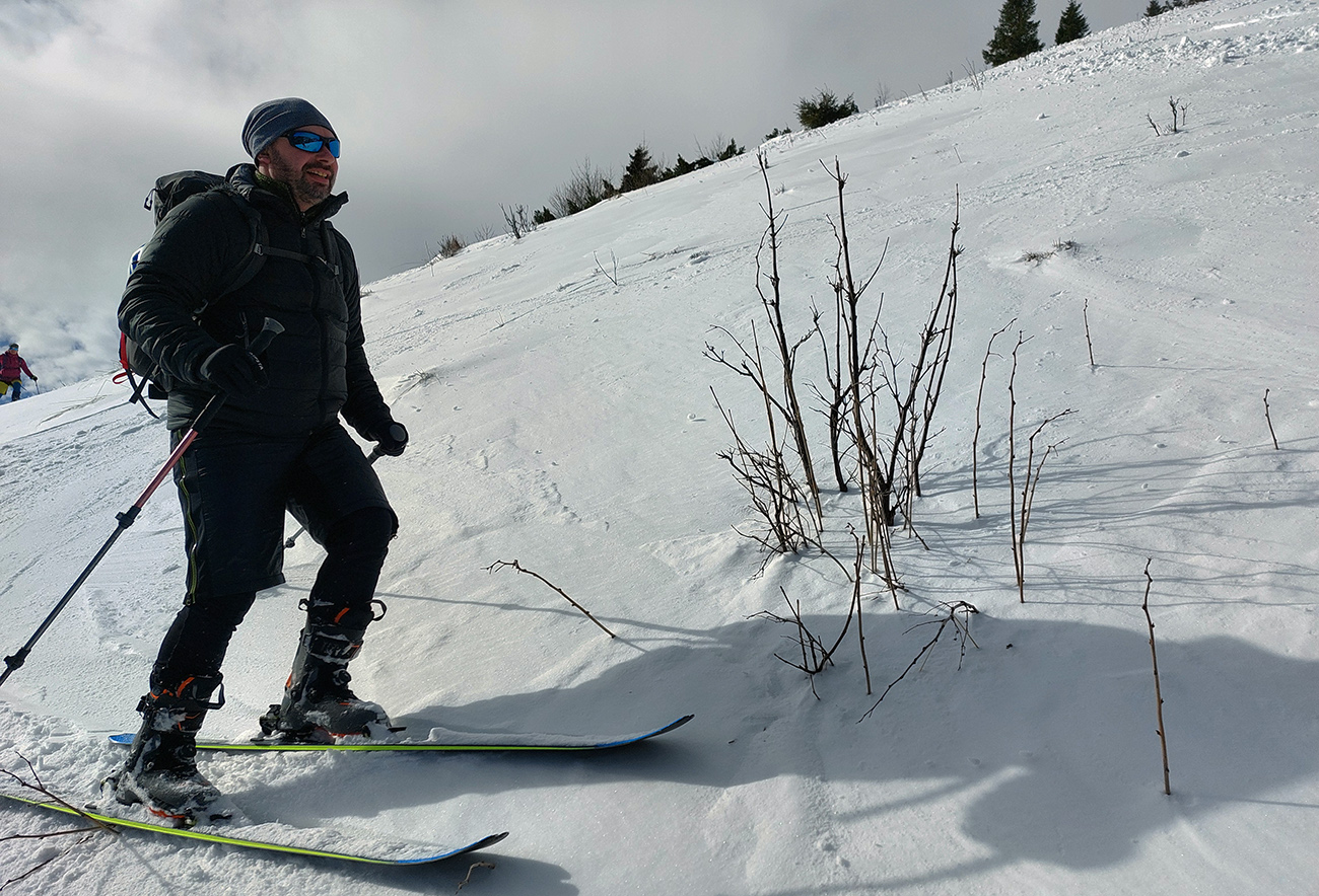 Lyžovačka od kríža po východnom rebre smerom k Limbe prekvapivo dobrá – na drsnom a tvrdom, ale takmer rovnom podklade. Občas snehová doska, nižšie už to na slnku vlhlo. Tak sme len zatočili doľava, na žltú značku, nalepili a davaj nazad do sedla. Tam je chodník pešiakmi z Limby predupaný poriadne.