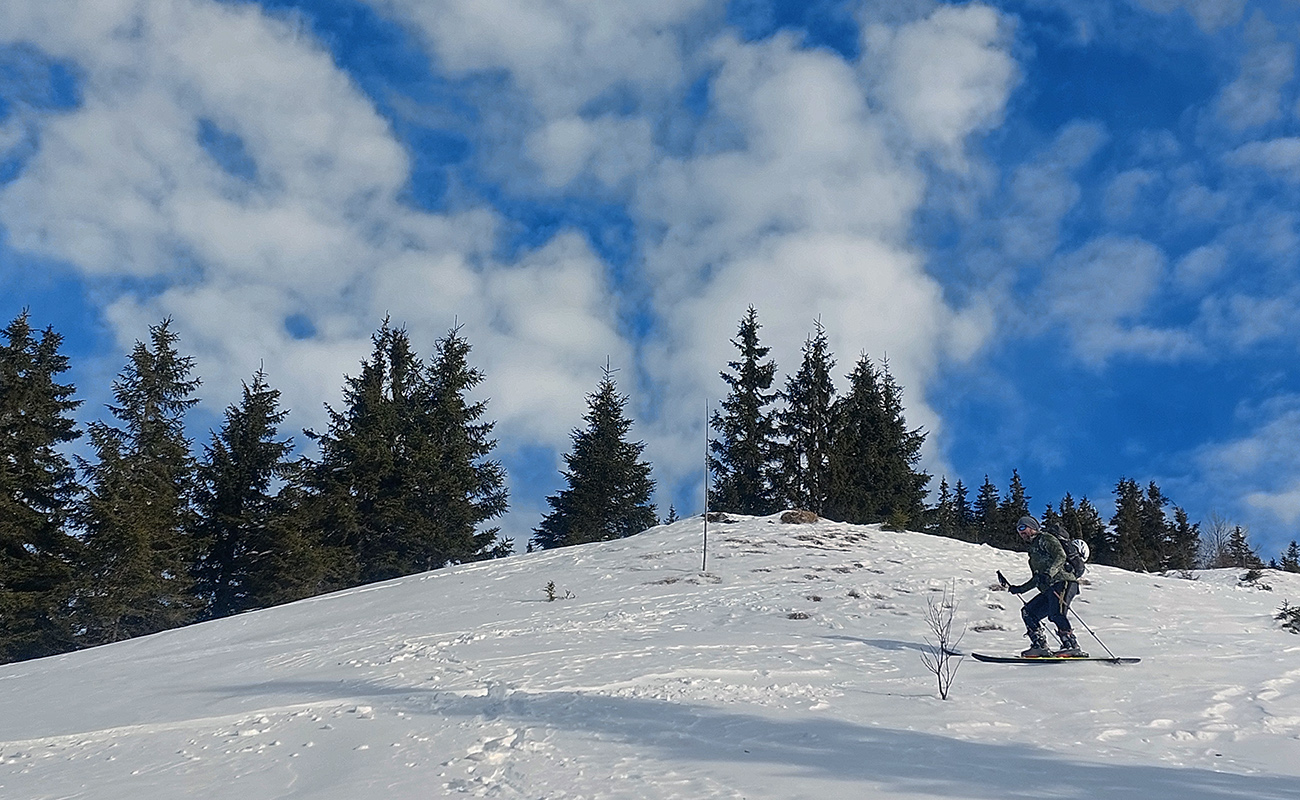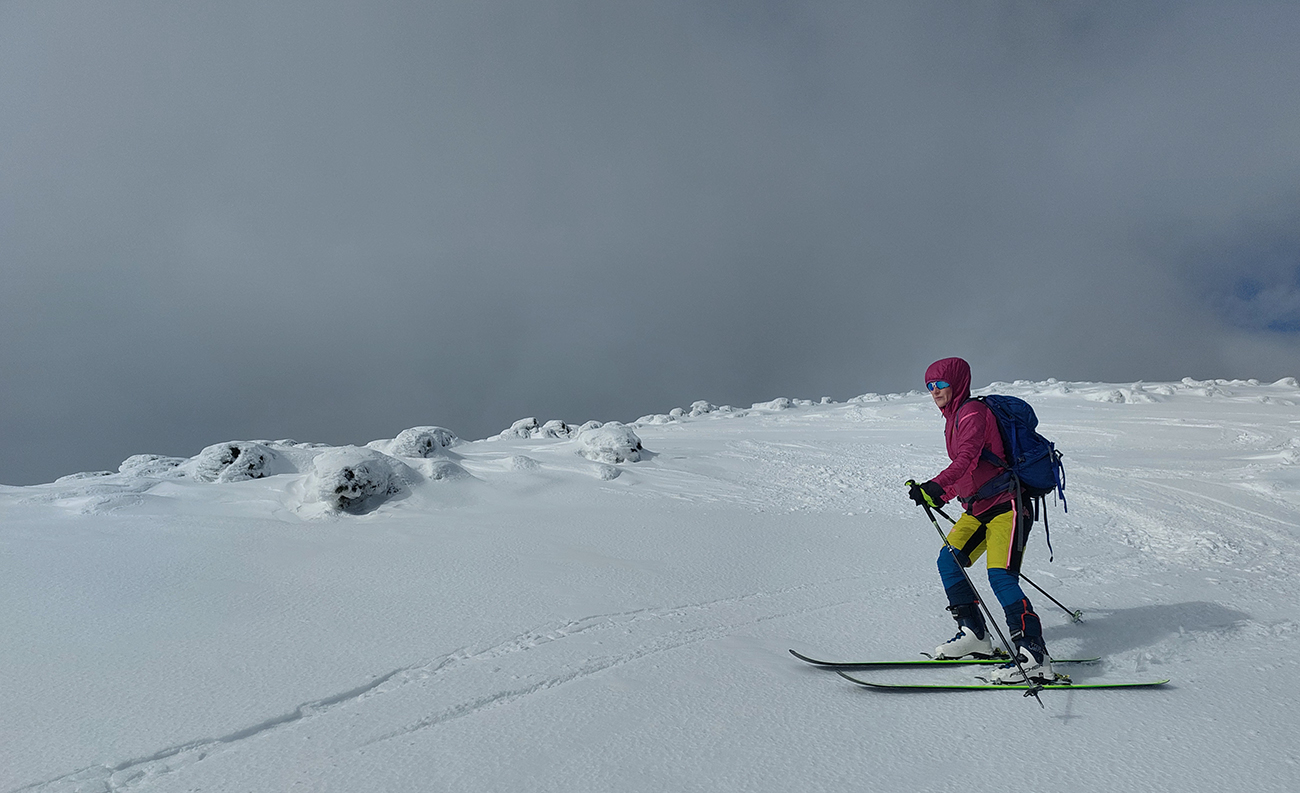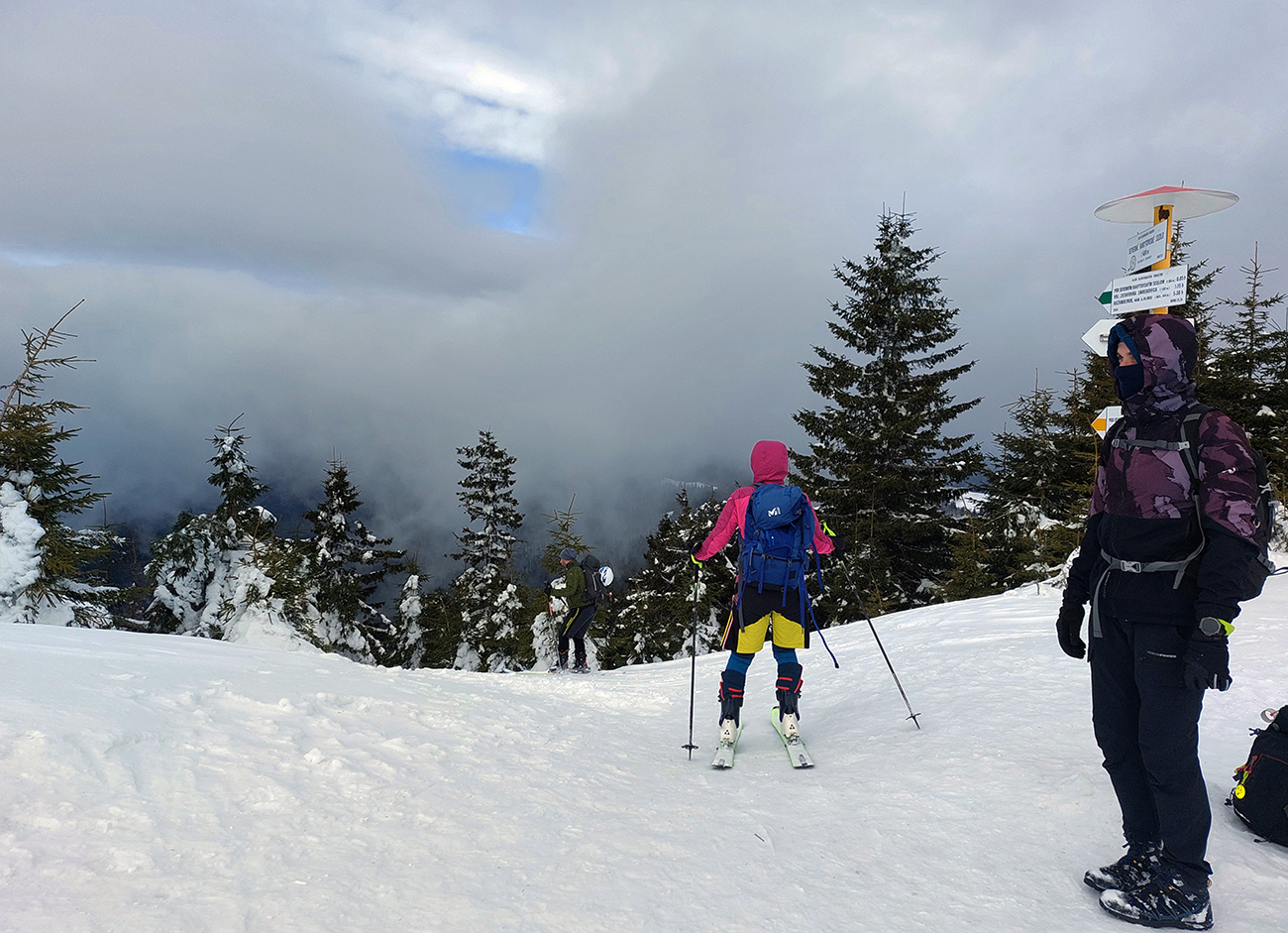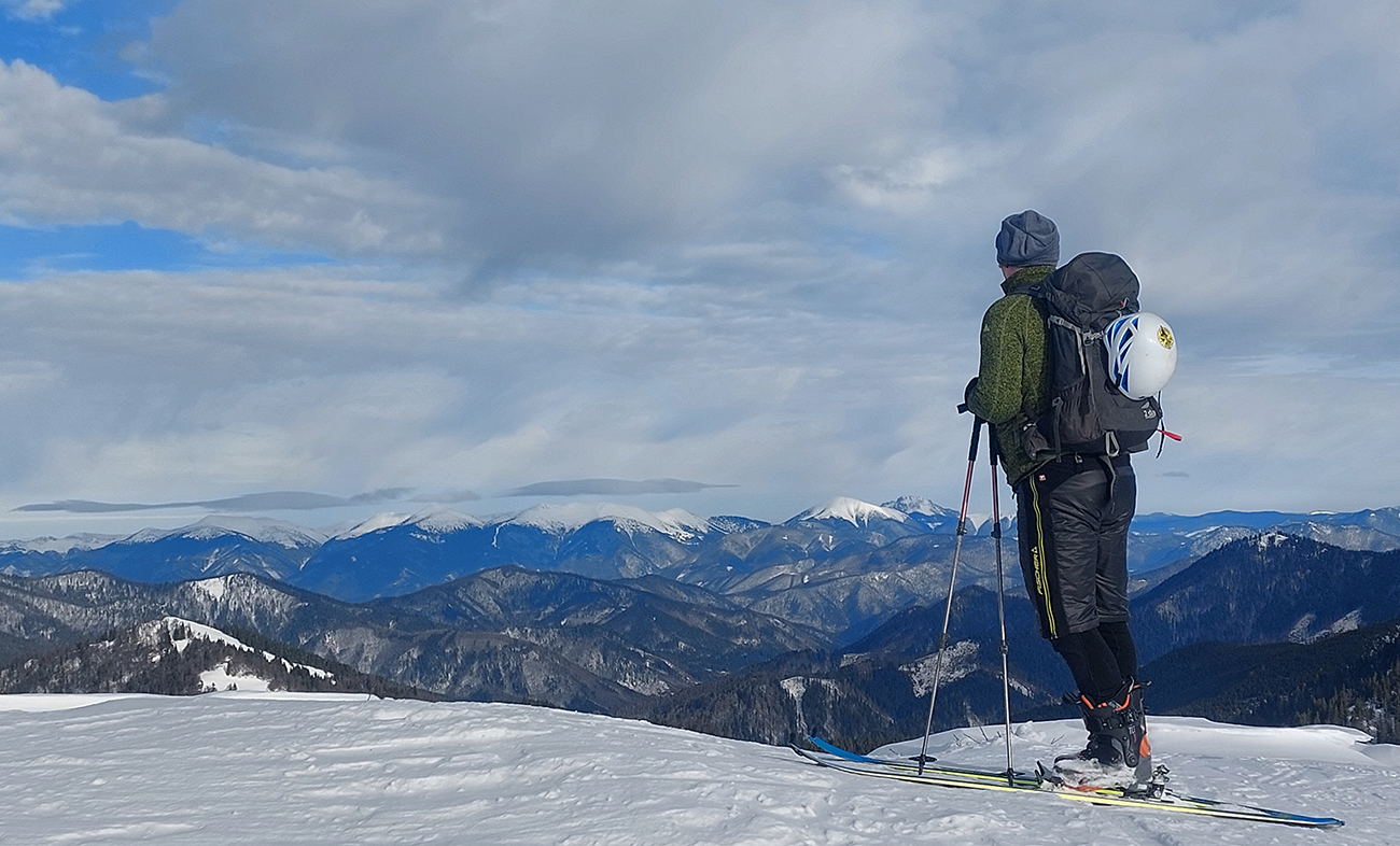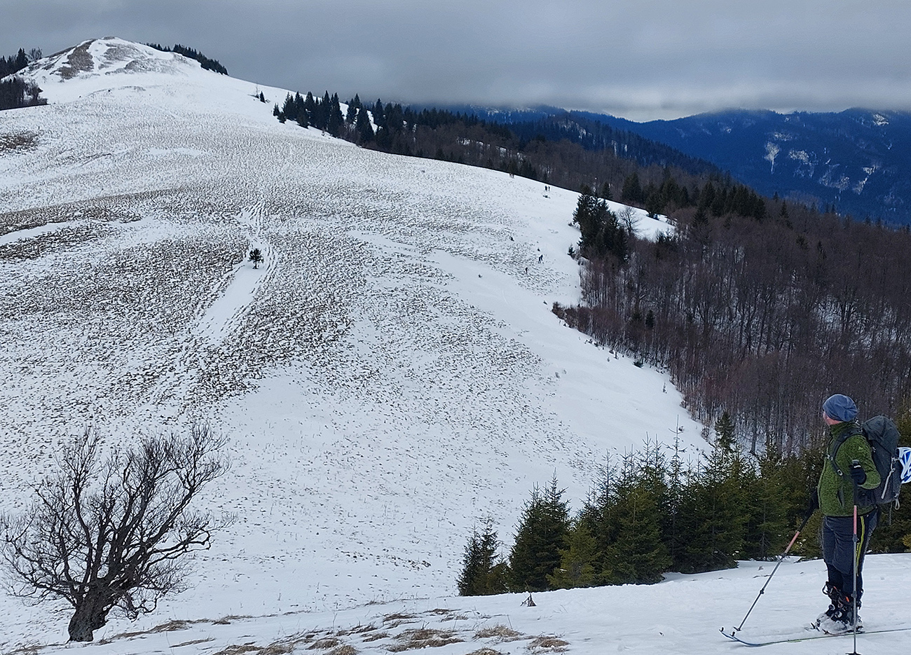 Lyžovačka od kríža po východnom rebre smerom k Limbe prekvapivo dobrá – na drsnom a tvrdom, ale takmer rovnom podklade. Občas snehová doska, nižšie už to na slnku vlhlo. Tak sme len zatočili doľava, na žltú značku, nalepili a davaj nazad do sedla. Tam je chodník pešiakmi z Limby predupaný poriadne.