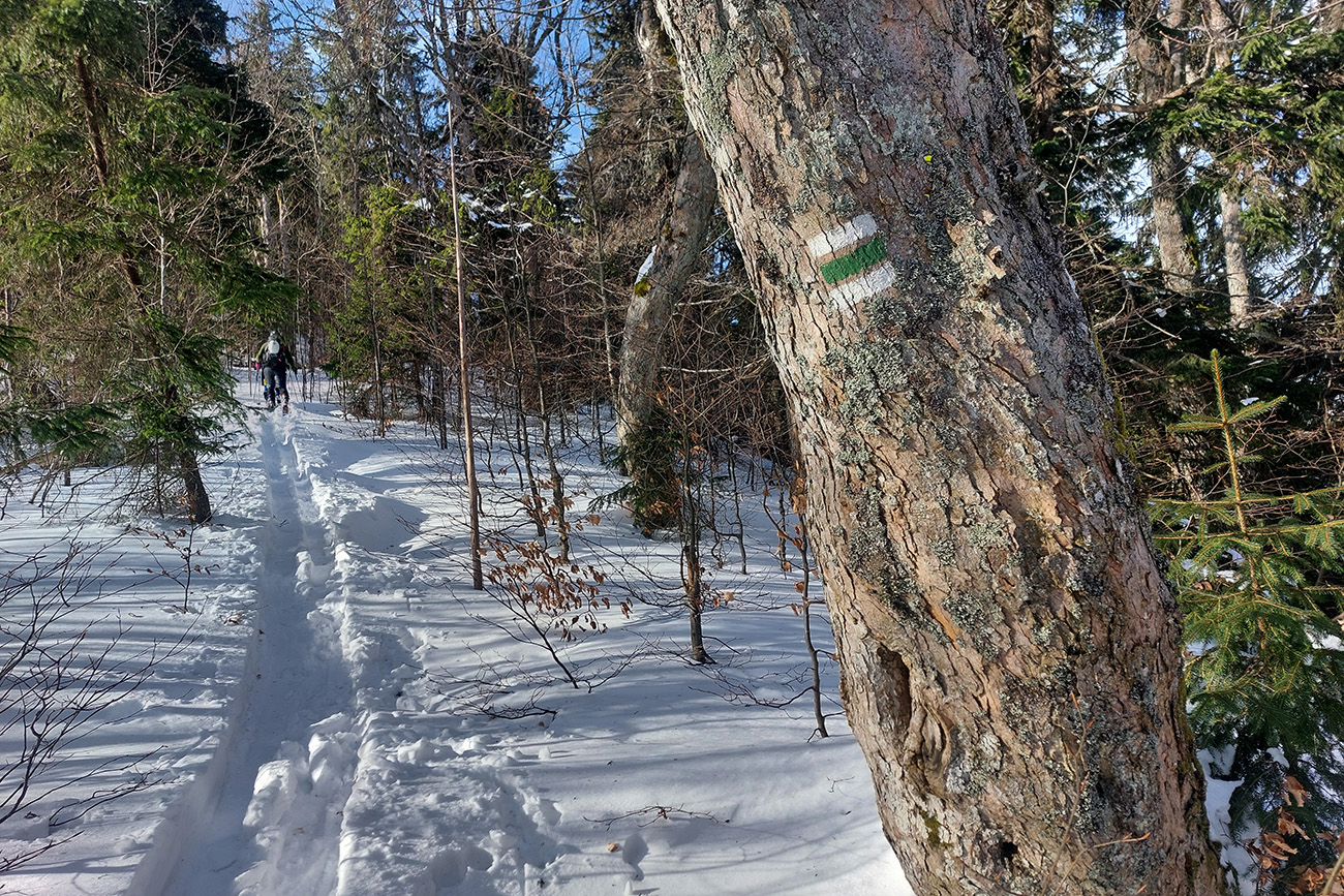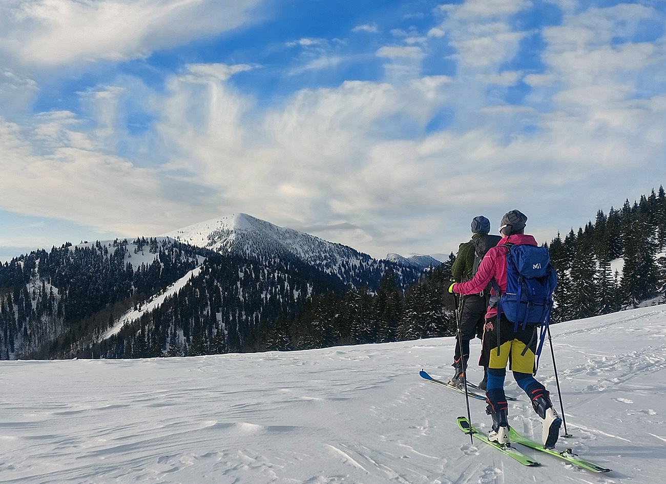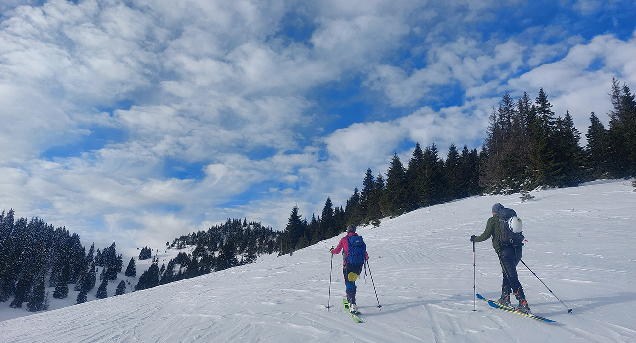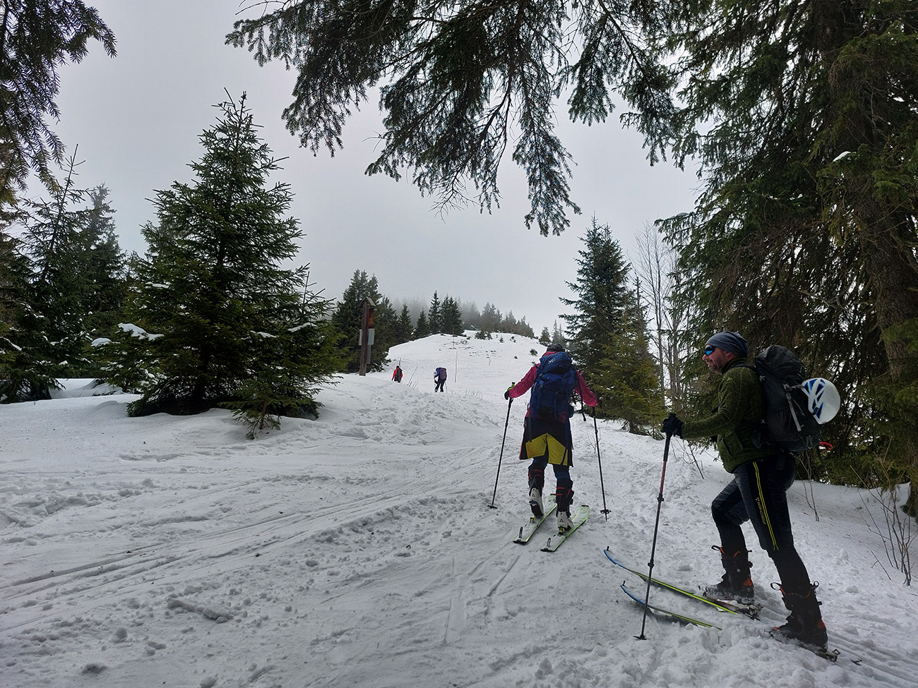 Lyžovačka od kríža po východnom rebre smerom k Limbe prekvapivo dobrá – na drsnom a tvrdom, ale takmer rovnom podklade. Občas snehová doska, nižšie už to na slnku vlhlo. Tak sme len zatočili doľava, na žltú značku, nalepili a davaj nazad do sedla. Tam je chodník pešiakmi z Limby predupaný poriadne.