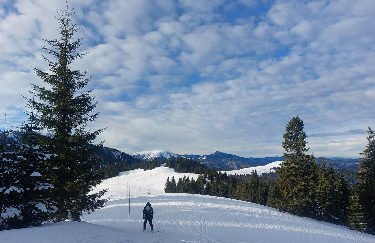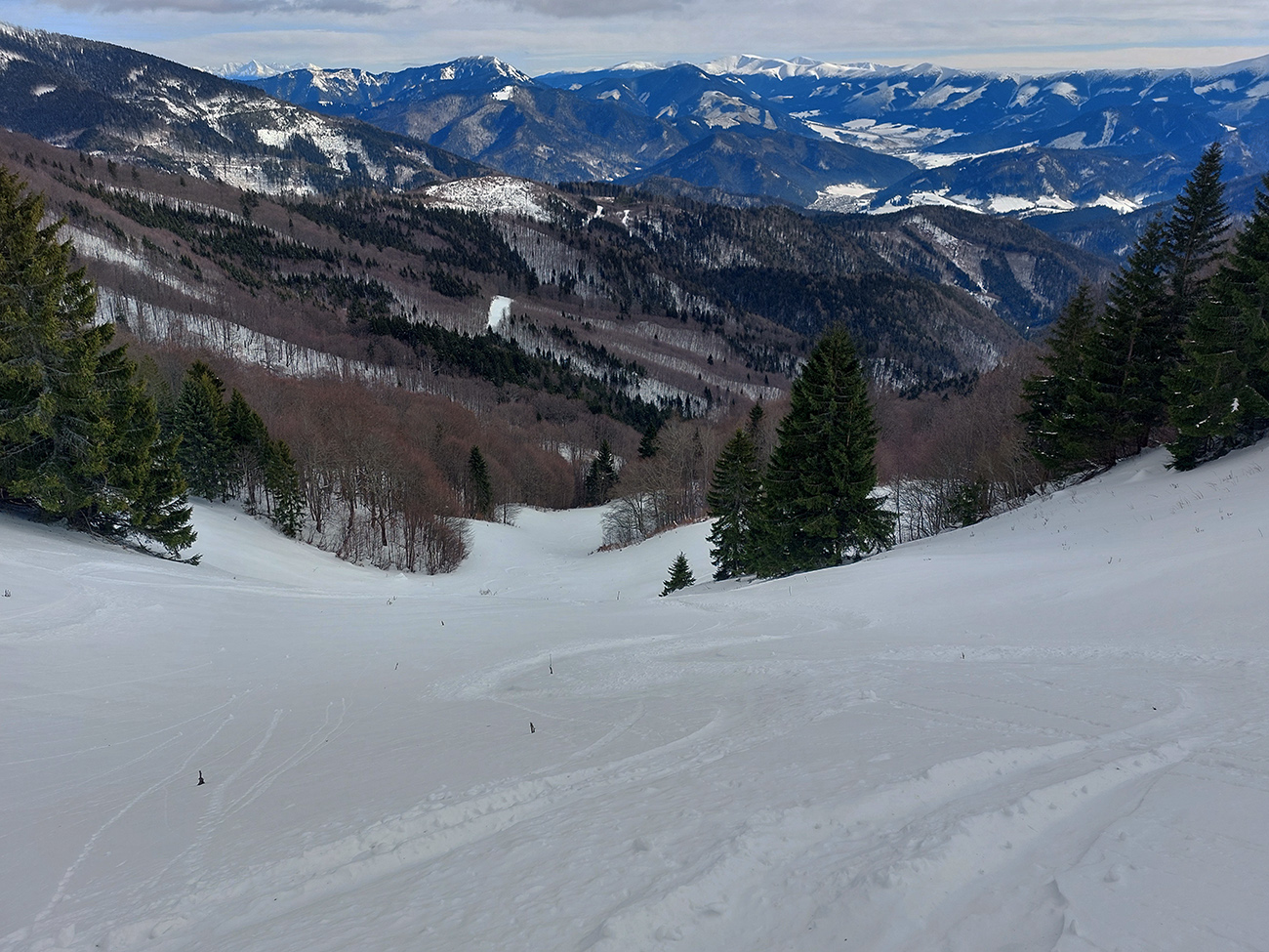 Na Skalnej Alpe vylízaný traverz až do ľadu, popri tyčiach ale aj trochu prachu a stopy relatívne komfortné. Vyhliadka na pomaly sa mračiace vrcholky Malej Fatry, zošup dole do jamy škrípavo-hrkotavý, so striedaním tvrdosti povrchov a trčiacimi kríkmi. Nižšie ale aj pár práškových oblúkov pre efekt sa zadarilo.