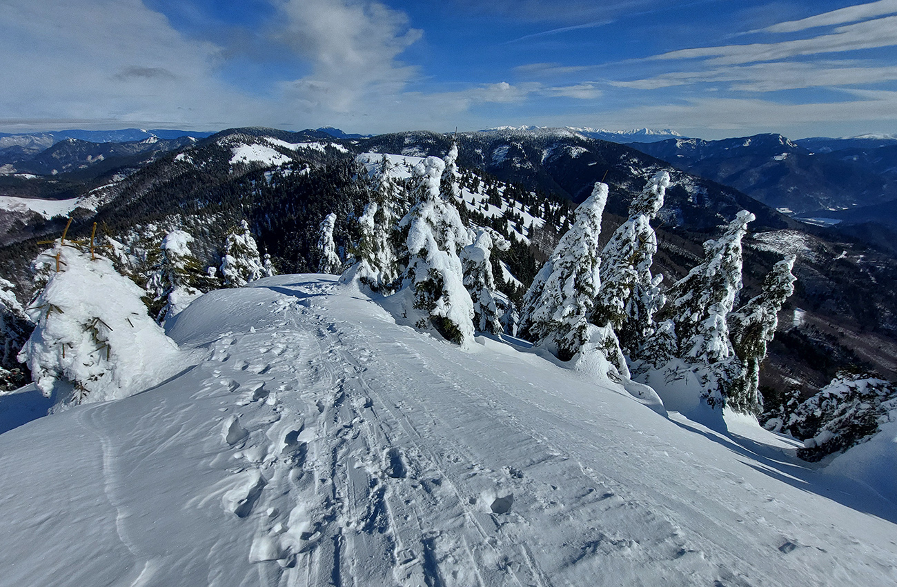 Cestou sme nahliadli do Markovičovej dolinky – nooo, vyzerala byť komfortne lyžovateľná, v jemnom prášku. Od chodníka dole. Vyššie viac zlízaná vetrom a snehové hrby nahusto, ale dalo by sa, až z vrcholu.