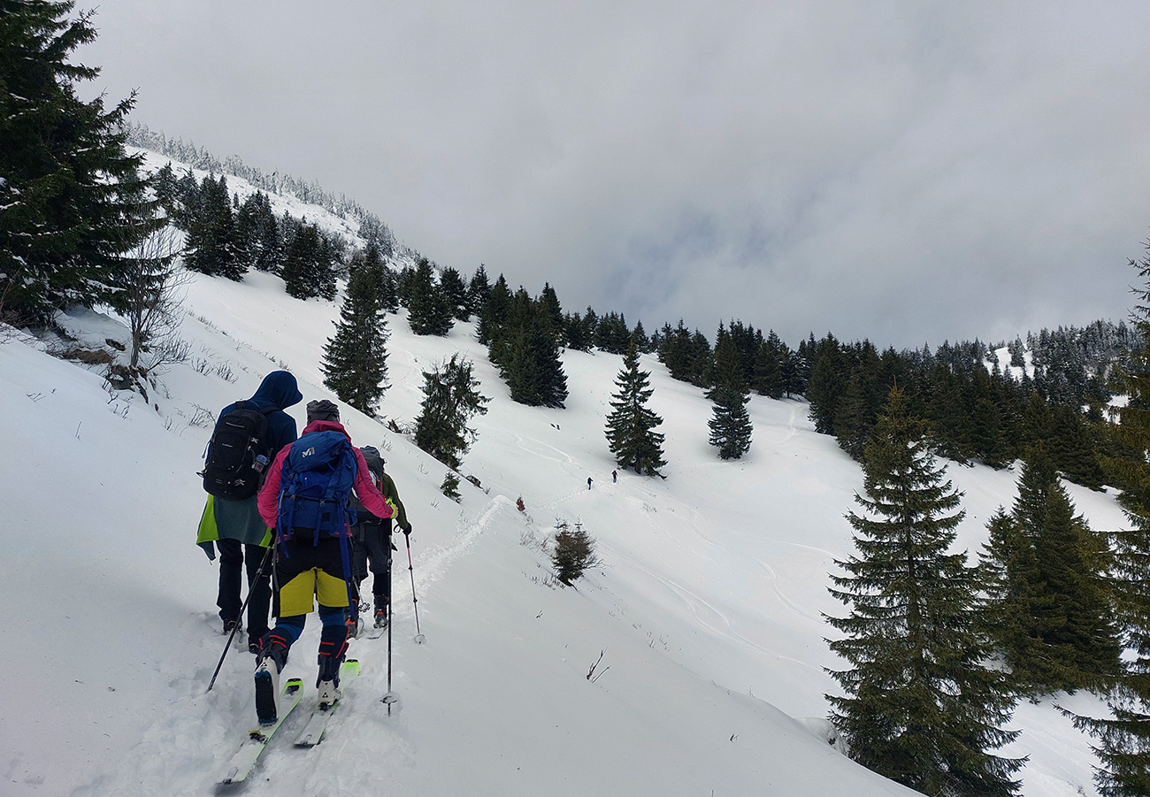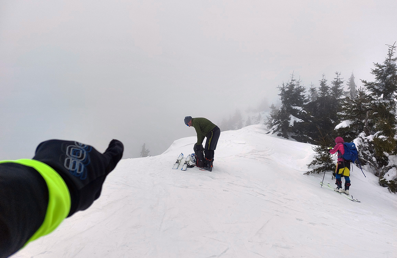 Traverz pod Rakytov komfortný (až na pár spartanských prekážočiek) – nový poprašok pomohol. Aj v strmších cikcakoch do Severného rakytovského sedla. Potom hore na vrchol radšej komfortnejšie s lyžami na hrboch – strmé je to, úzke a miestami ľadové. Machri to ale dávali na pásoch celé.