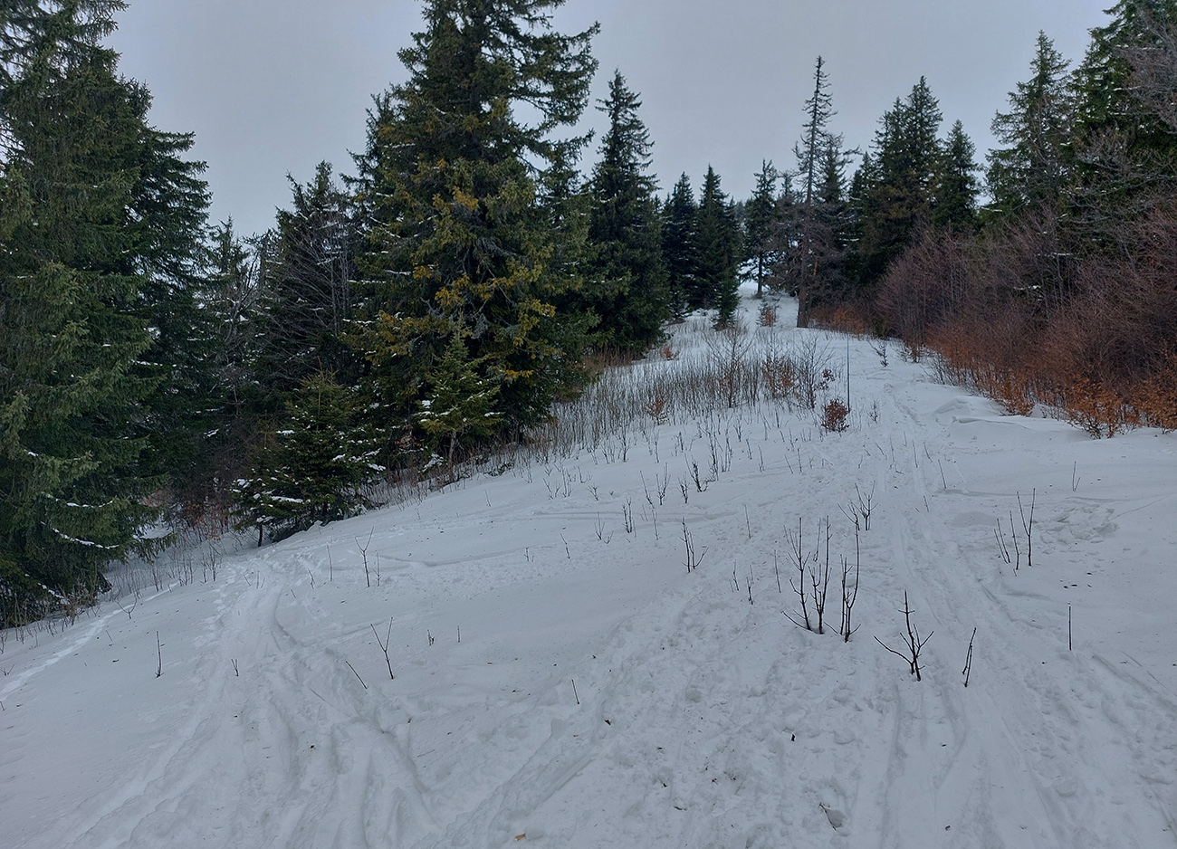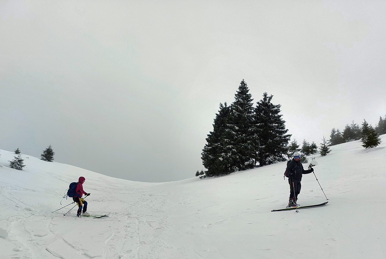 Na vyhliadke na Skalnej Alpe už viditeľnosť skoro nijaká, tak sme len odlepili a skľučkovali muldou cez záveje k zákrute na Močidle. V pláne bola síce ešte aj samotná Smrekovica, lebo jej lúka na severne orientovanom svahu vyzerala z diaľky chrumkavo, ale vraj síl už nebolo. Tak koniec, zamierili sme po ceste a po bežkárskych tratiach nazad k autu a potom do Granitu ten parkovací biznis spraviť. A končili sme v pravej vianočnej metelici :-)