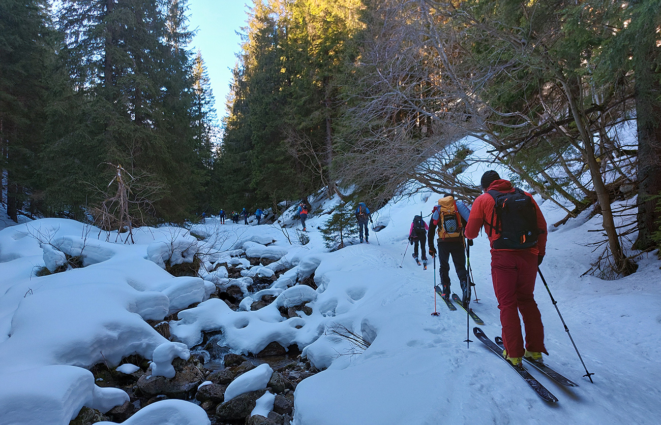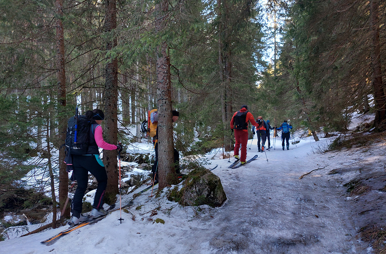 Najprv ale peši po prašnej ceste popri zasnežovacích nádržiach, tam sa už dalo pri smerovníku „Tri vody“ skočiť do lyží. Lepšie by ale boli korčule, niekde je tam aj seriózny, priesvitný ľad. V lese tiež fajne ľadovo, ruky dostali zabrať, aj pár malých obchádzočiek a „ľadovcových trhlín“ sa vyskytlo, na odbočku do traverzu potom pekne s lyžami v rukách po exkluzívnom a najmä strmom ľade.