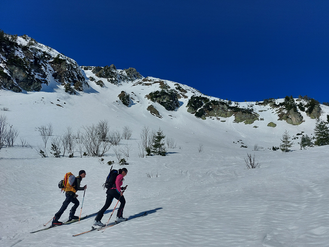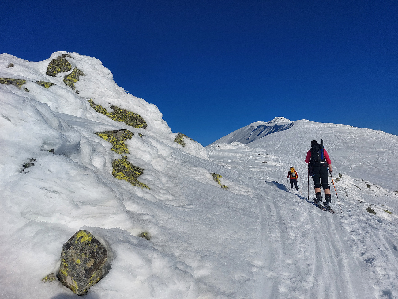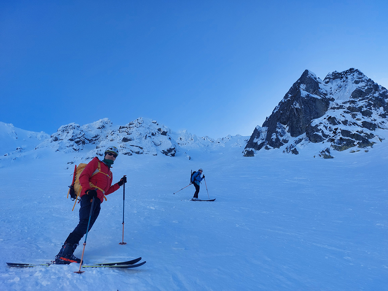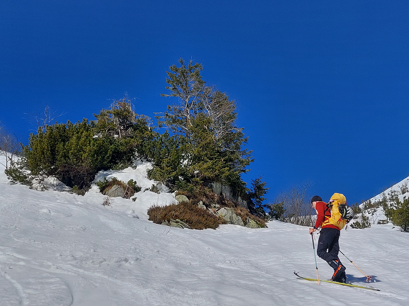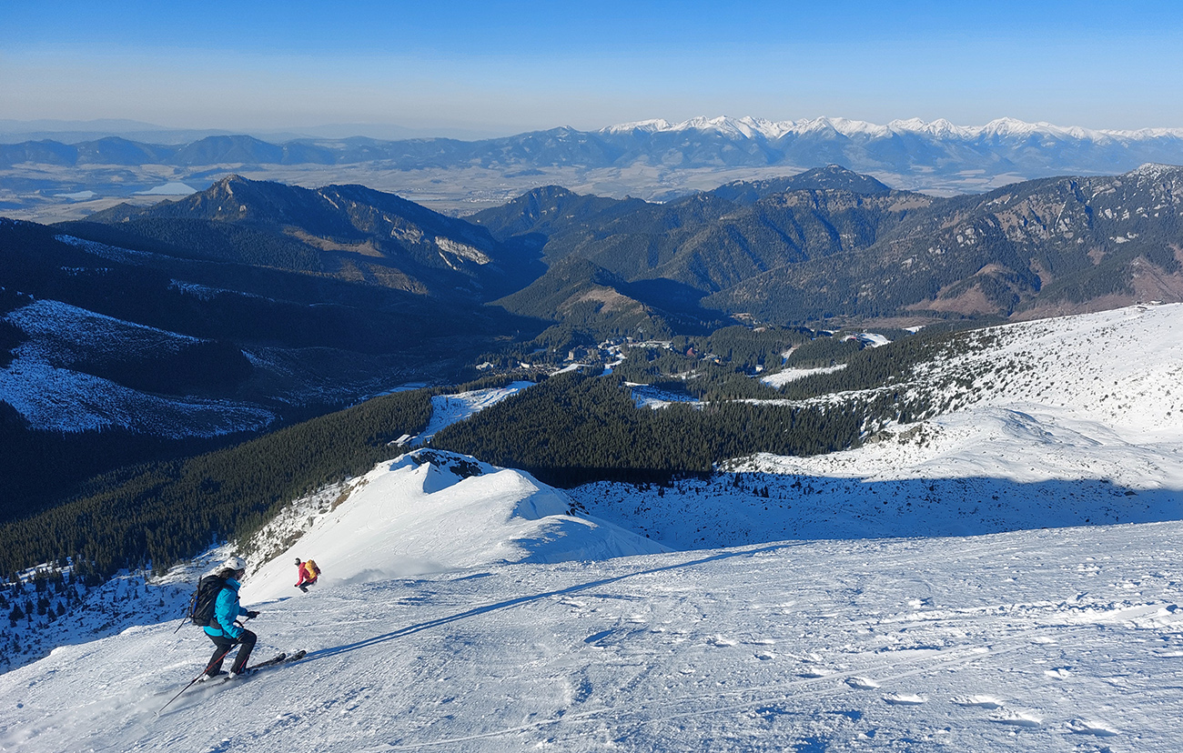 Ešte sme vyťapkali na Poľanu a nažhavení na jarné firny sme to odtiaľ stočili priamo dole po pláňach, niekam až tesne nad Vajskovský vodopád. Firny exkluzívne – na pevnom podklade natopená taká akurátna vrstvička, vôbec sa to ani v nižších polohách neborilo. Pre veľký úspech sme si to dali aj druhý raz, to už ale slnko dávalo poriadne cítiť svoju silu.