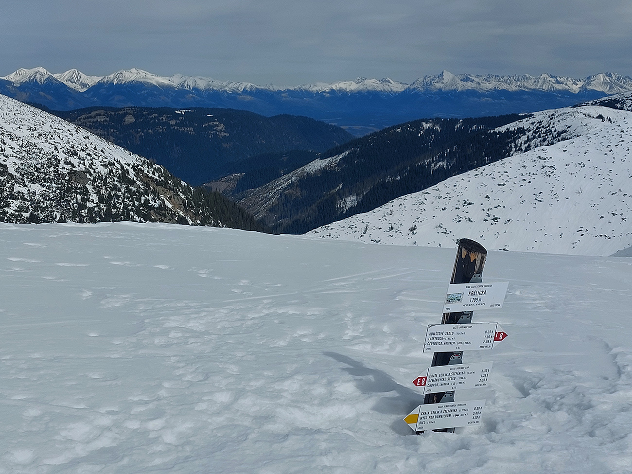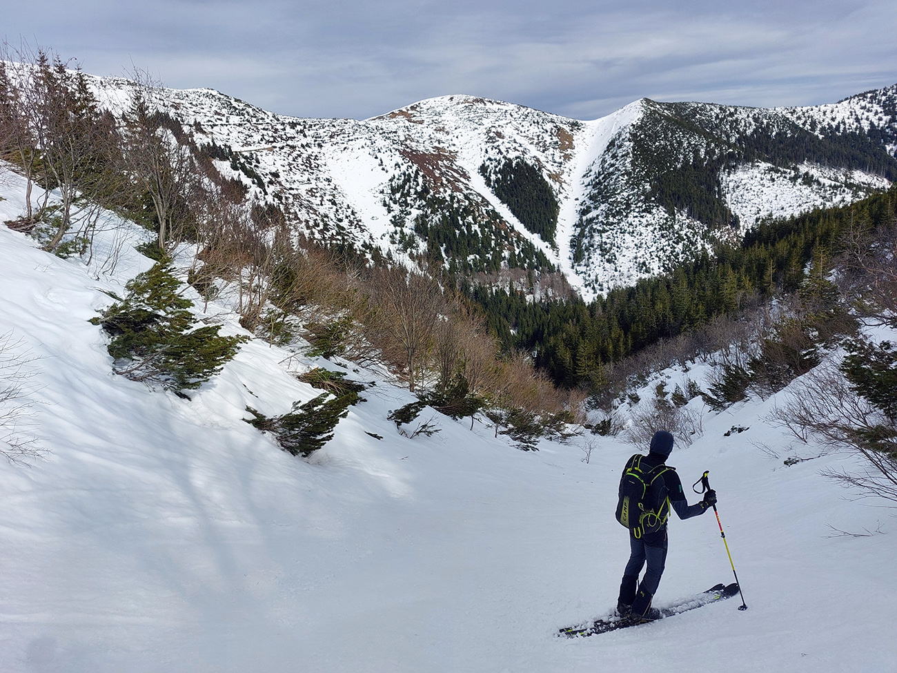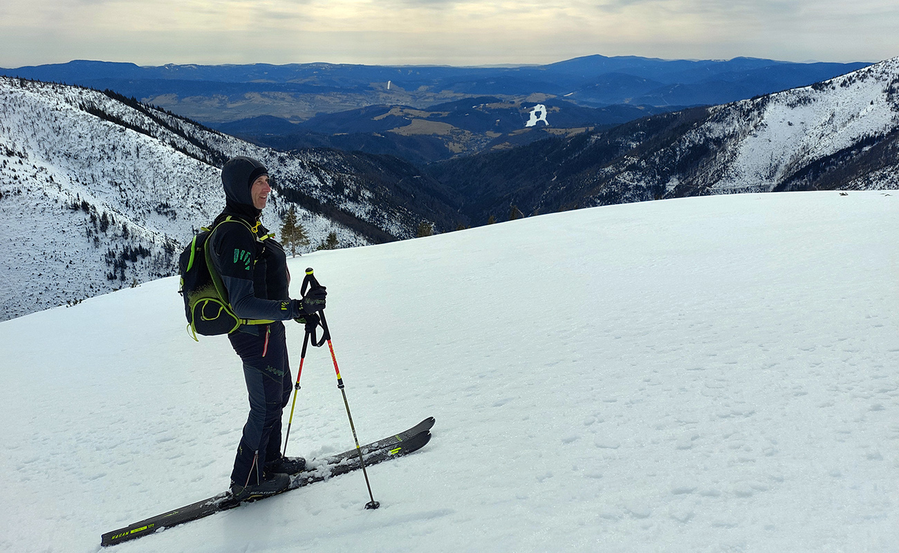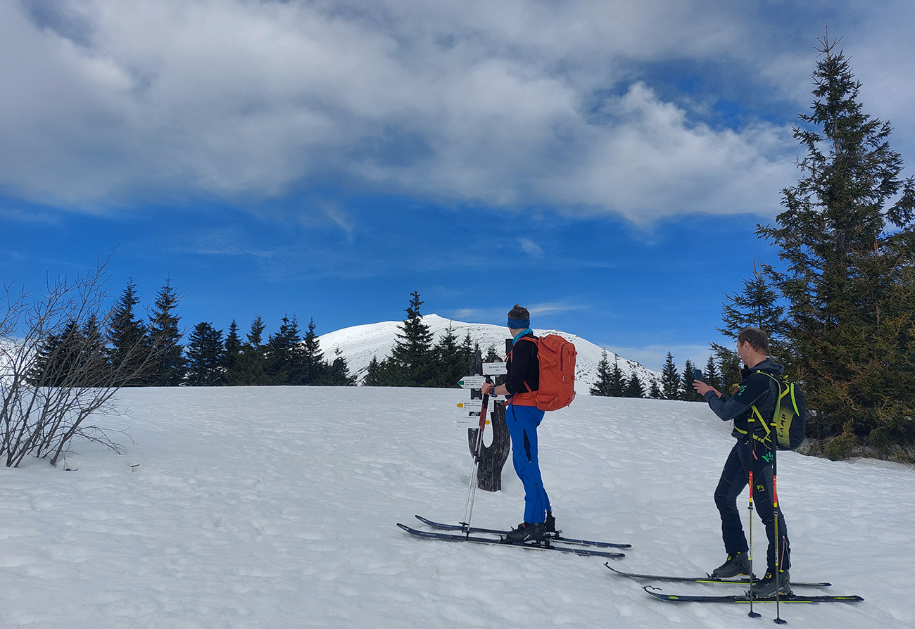 Dve nohy už chytajú akúsi krízu, ale aj čas pokročil, tak zhora šmýkame po hrebeni nazad na Besnú, že teda ešte ten „východný centrál“ dáme a z neho po zelenej značke vylezieme do Kumštového sedla. Zámer čiastočne plníme. Lyžovačka výborná, aj pod Besnou to už zmäklo, len zelenú značku chytáme iba chvíľu na spodku, potom sa smerom hore stráca a stopy vedú inde. Tak traverzujeme priamo na Panskú hoľu a dobre robíme.