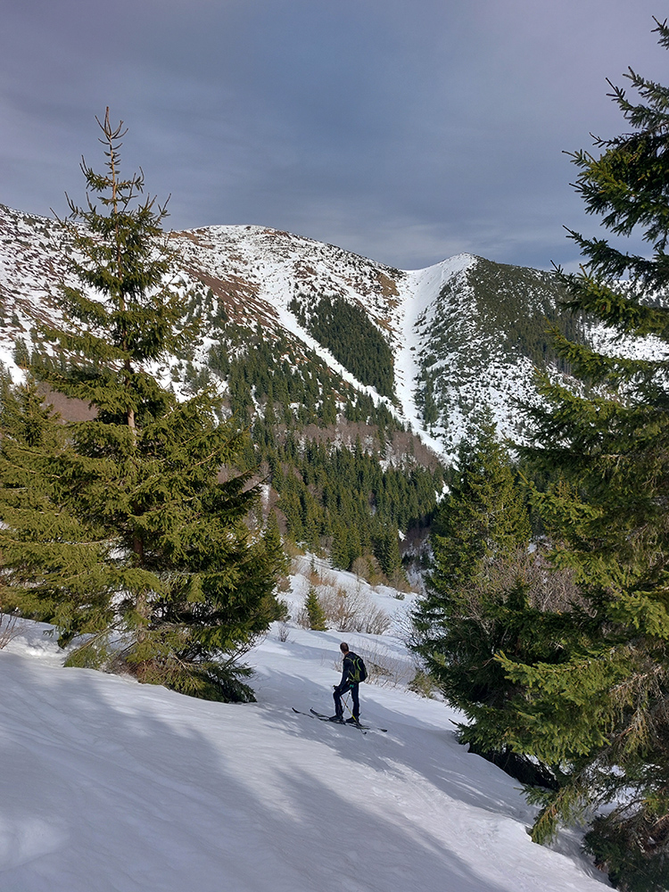 Nazad hore a hneď spomedzi vrcholov sa spúšťame na druhú stranu, na západ. Tentokrát muldou priamo do Pošovej Mlynnej. Tvrdá je, ale nie ľadová, len čím nižšie, tým na kratšie oblúky. Zastavuje nás zúženie a poprepadané diery do potoka. Meter snehu naviac a dalo by sa zísť podstatne nižšie. Pri naliepaní obzeráme hlboké a zablatené stopy „domáceho pána“ pri potoku, potom strmo stúpame vedľajšou muldou, priamo na Králičku.